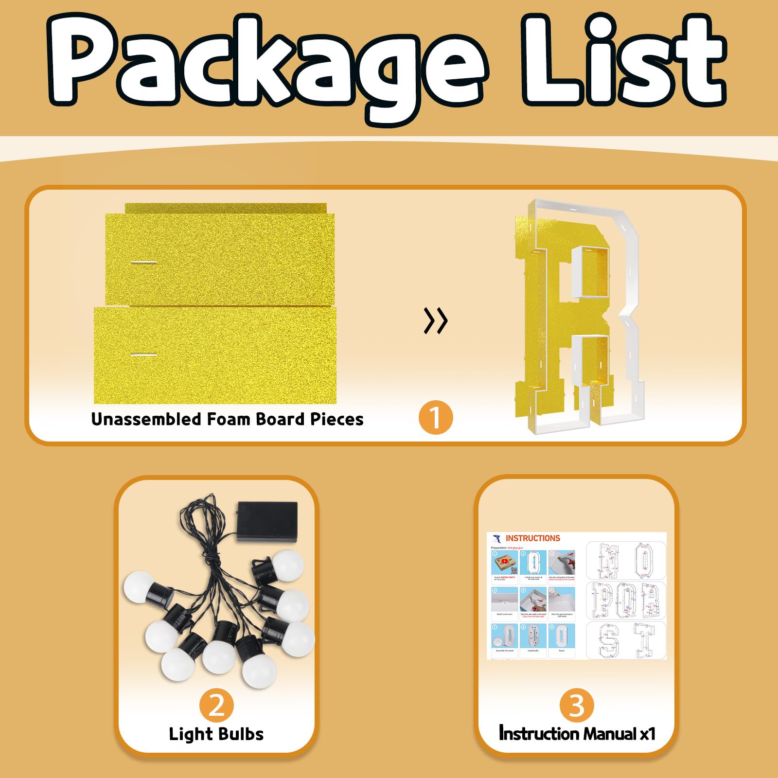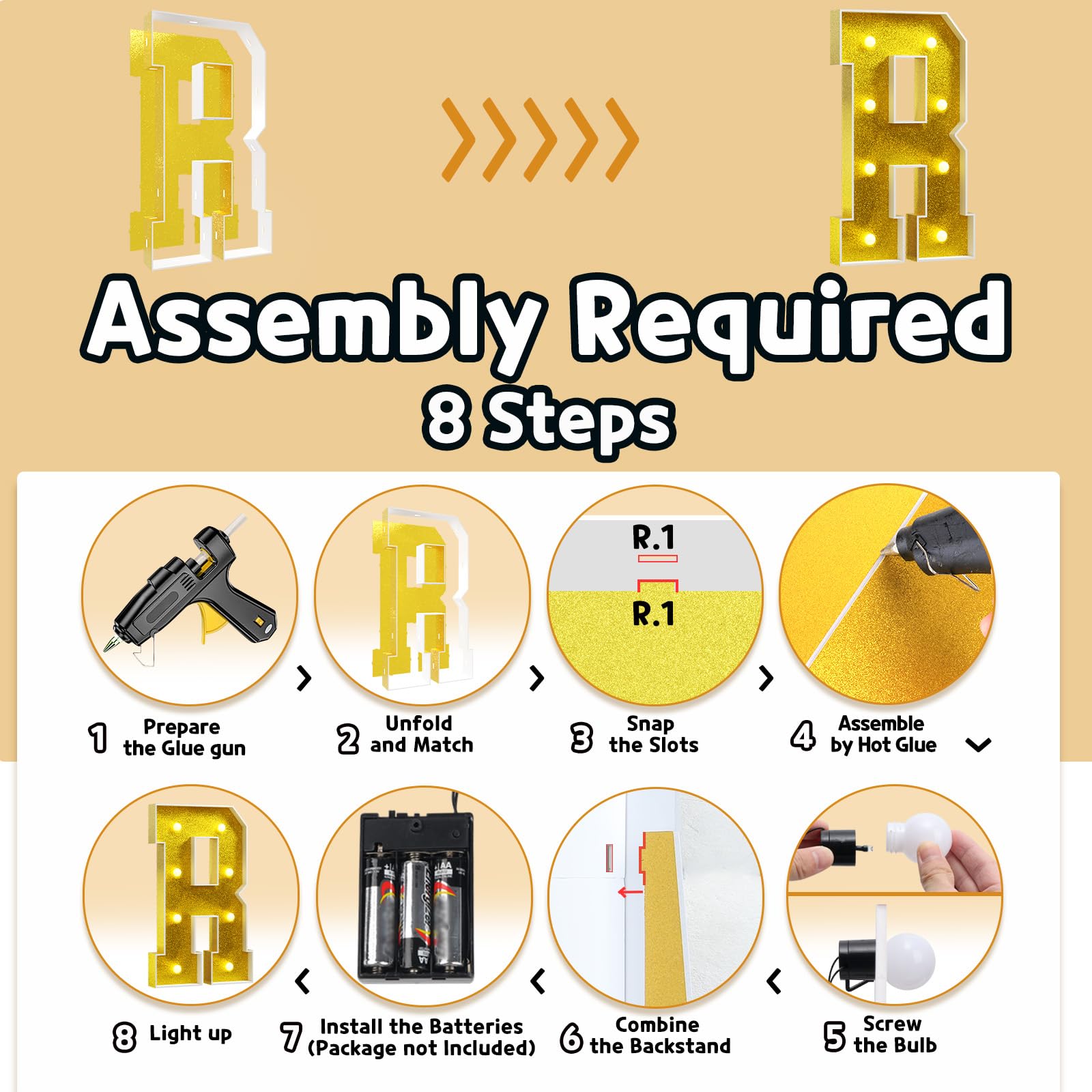 - Q: How do I assemble the marquee letter for use? A: Assembly is straightforward. Each package includes pre-cut frames and a light string. Simply match the slots on the board with the frame, secure them with a hot glue gun, and screw in the bulbs.