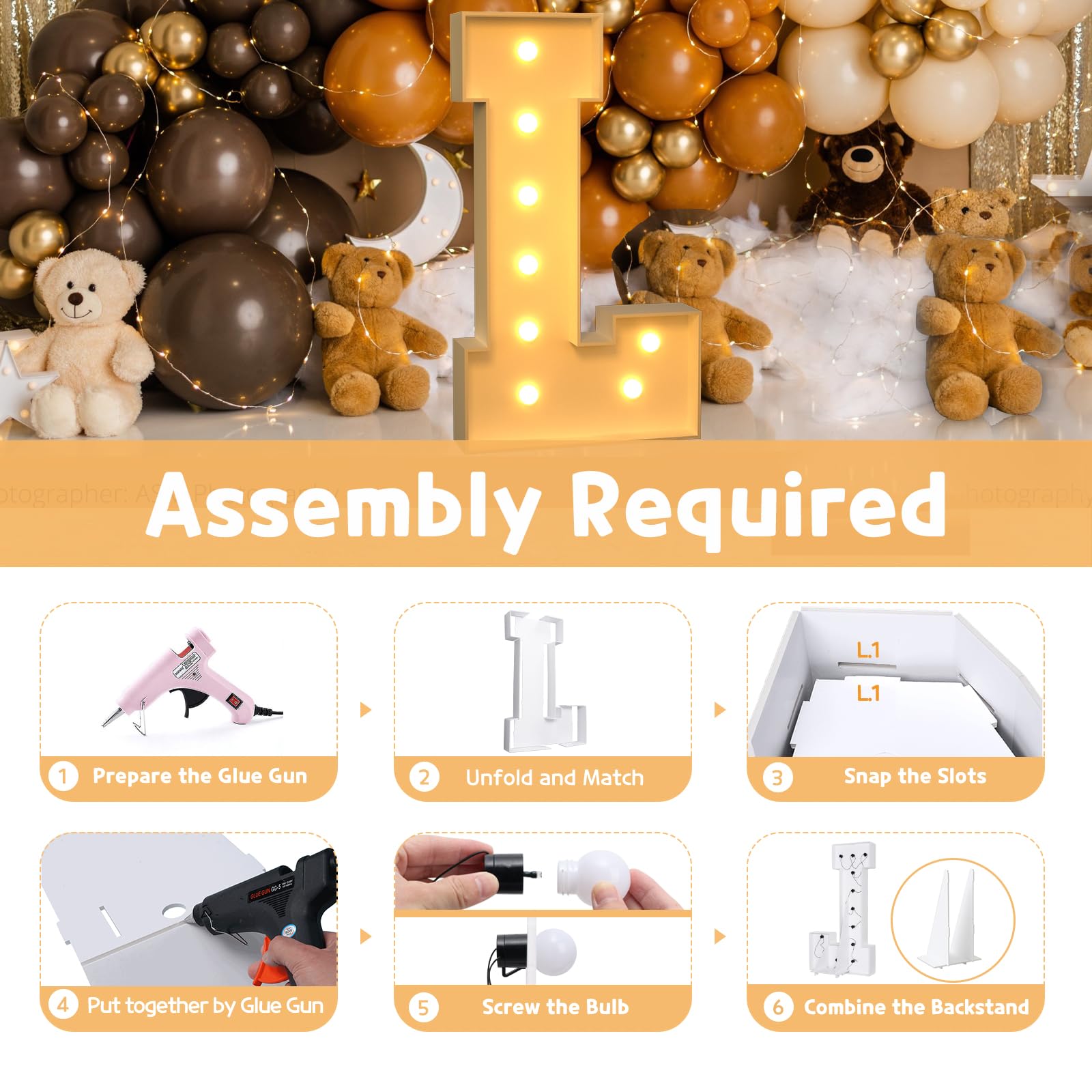 - Q: How do I assemble the marquee letters? A: Assembly is straightforward: each marquee letter comes with pre-cut frames that you need to match and glue together using hot glue. After that, simply screw the bulbs onto the board and install 3 AA batteries (not included).