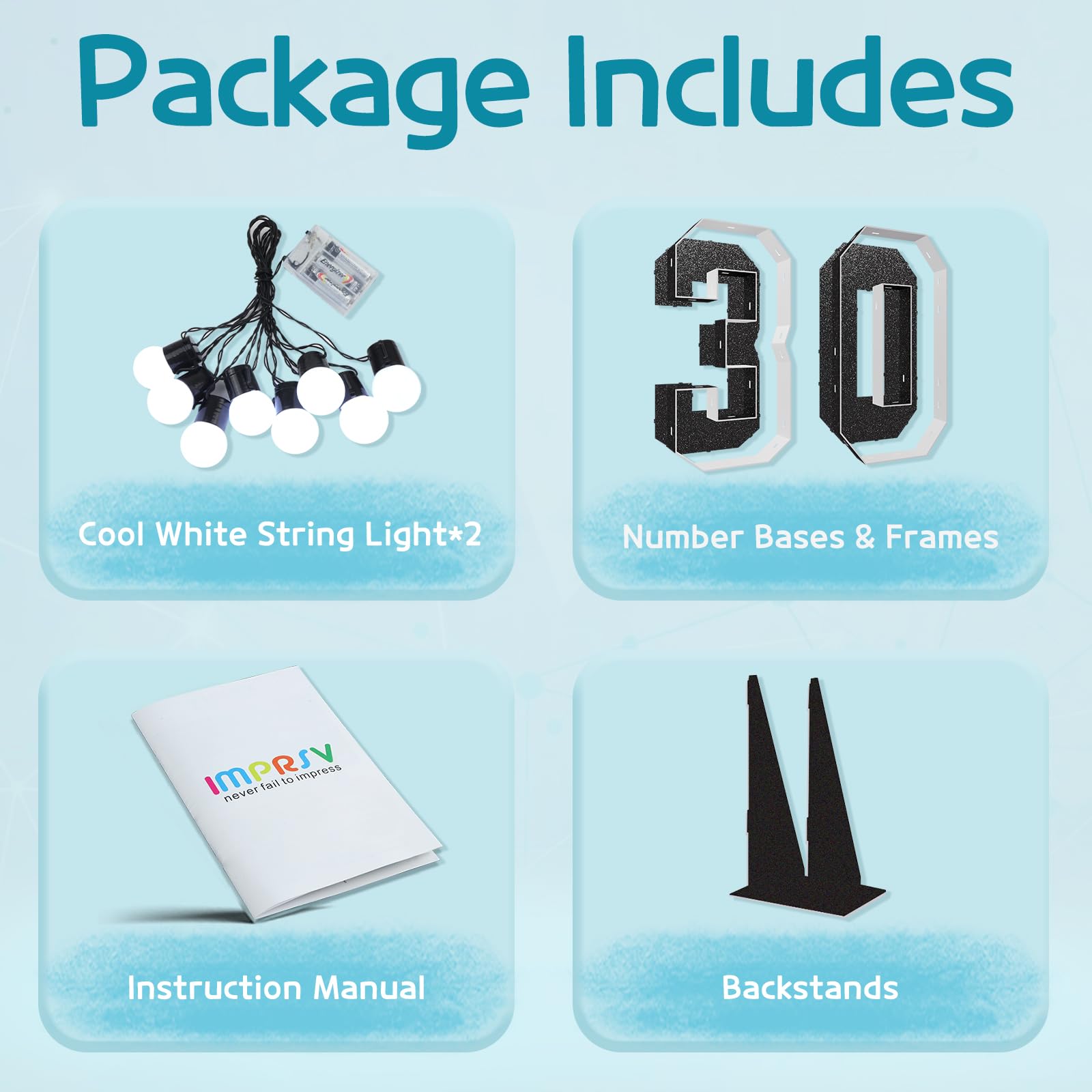 - Q: What kind of lighting is included with the marquee numbers? A: The package comes with a string light to illuminate your marquee numbers, creating a beautiful display for your party backdrop.