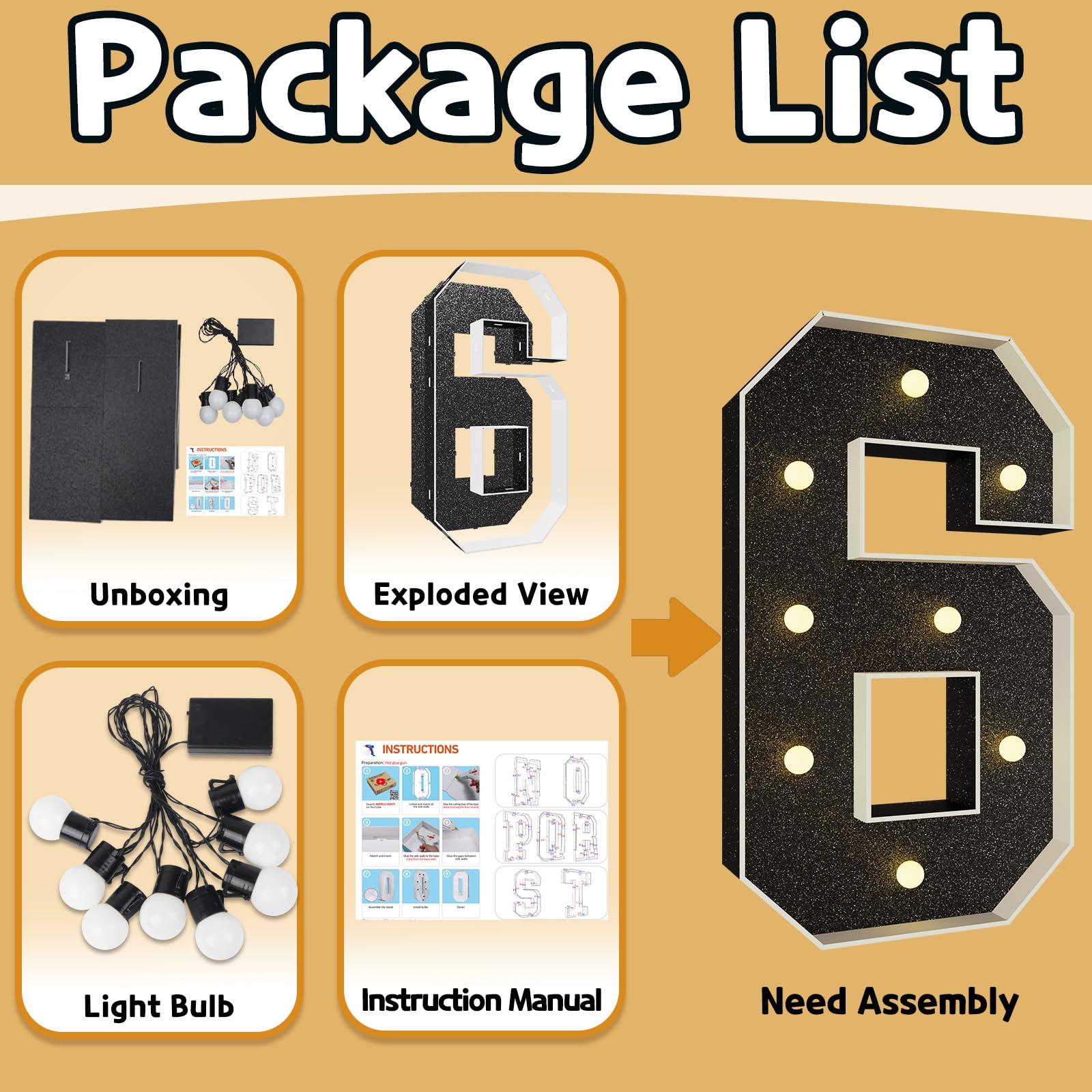 - Q: How do I assemble the marquee numbers? A: Assembling the marquee numbers is easy. Each package includes pre-cut foam board number frames, a light bulb string, and assembly instructions. Simply match the slots on the board with the frame, secure them with a hot glue gun, and attach the bulbs by screwing them onto the frames.