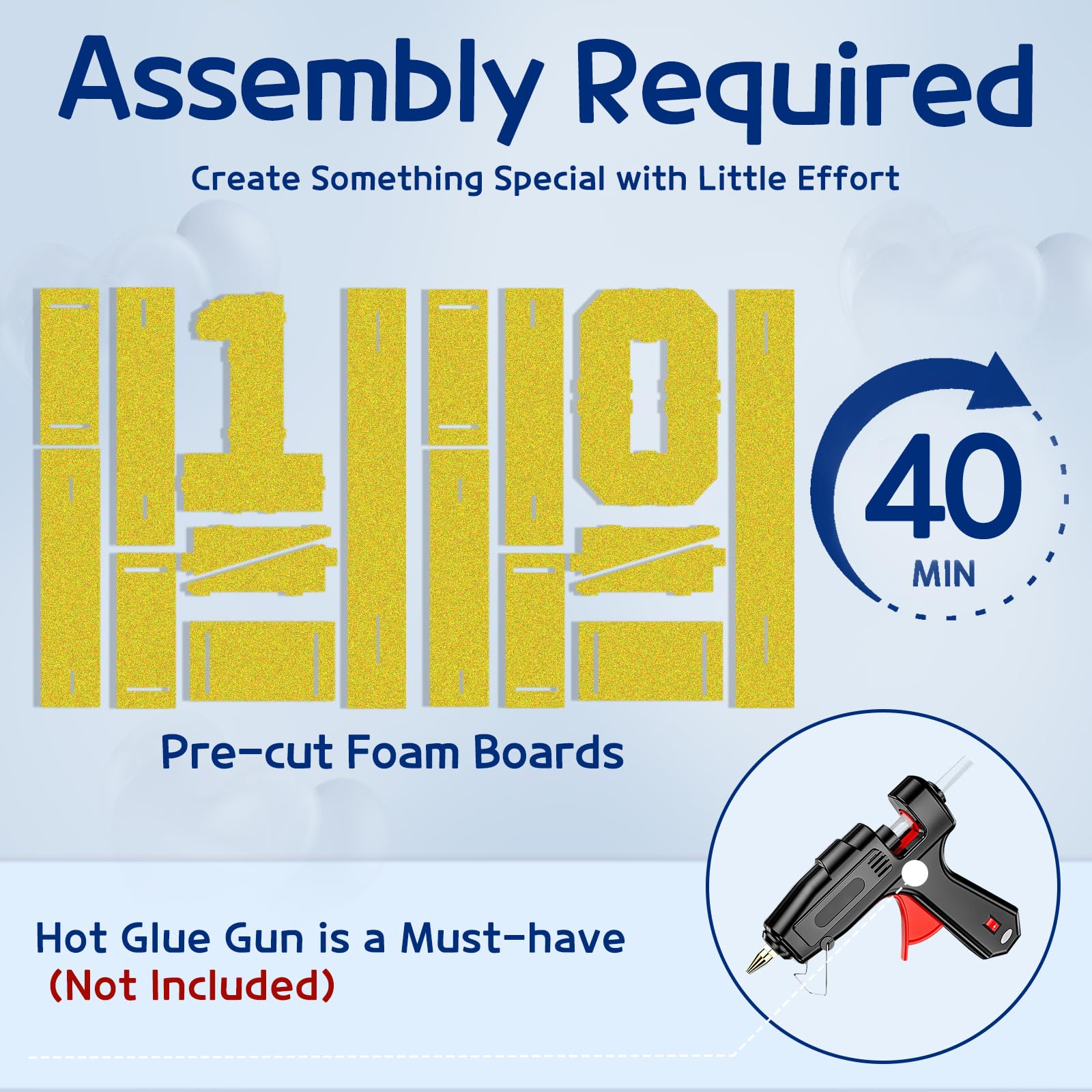 - Q: Is assembly required for the marquee numbers? A: Yes, assembly is required for the imprsv Marquee Numbers. The package includes pre-cut foam boards and an easy-to-follow instruction guide. A hot glue gun is necessary for assembly, which is not included in the package.