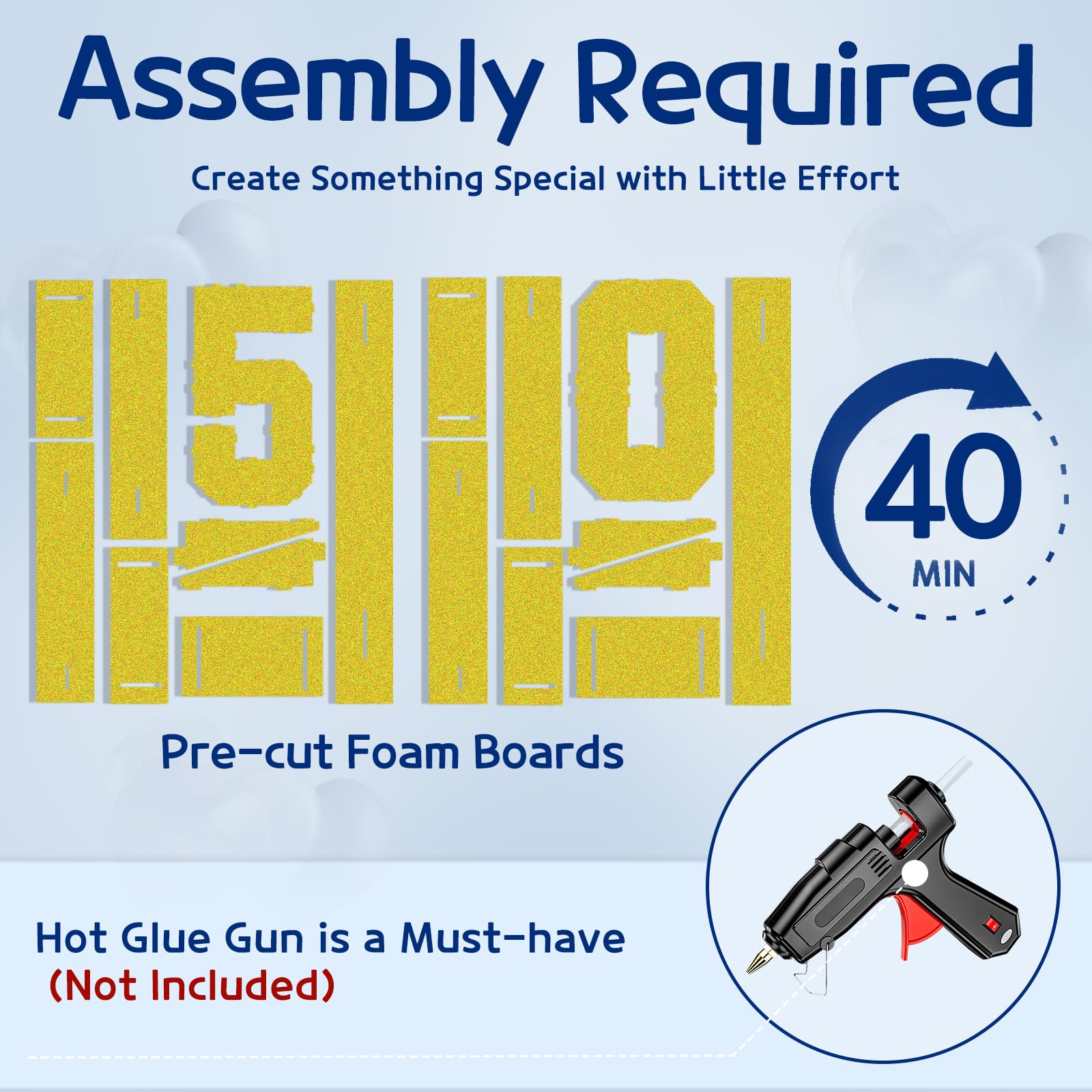 - Q: How do I assemble the marquee numbers for my party? A: Assembly is user-friendly with pre-cut foam boards and an innovative slot design. The package includes a detailed instruction manual and access to a video tutorial to guide you through the process. A hot glue gun is required for assembly, but it is not included in the package.