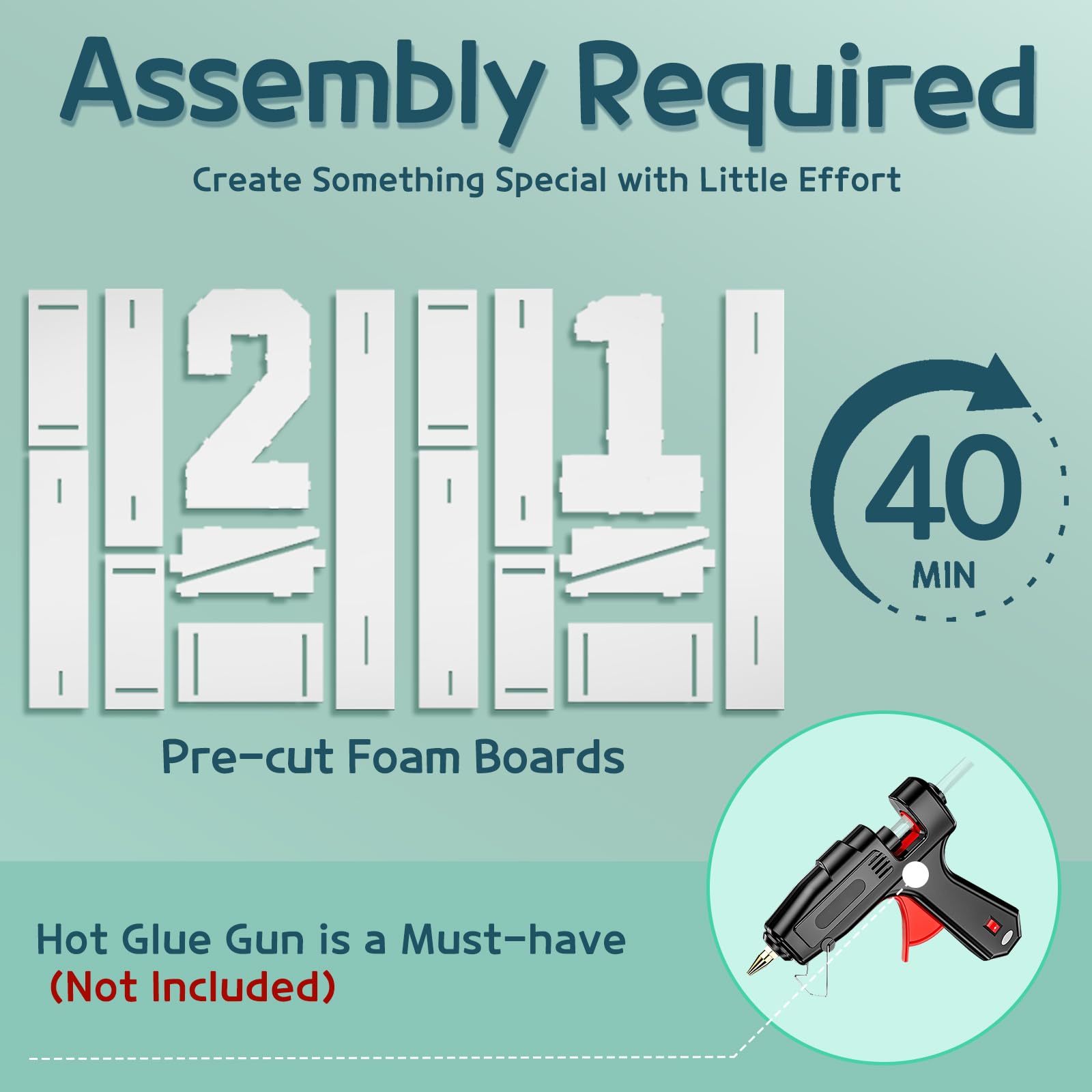 - Q: Is assembly required for the marquee numbers? A: Yes, assembly is required. The large marquee numbers come as pre-cut foam boards, and you will need a hot glue gun for assembly, which is not included in the package.