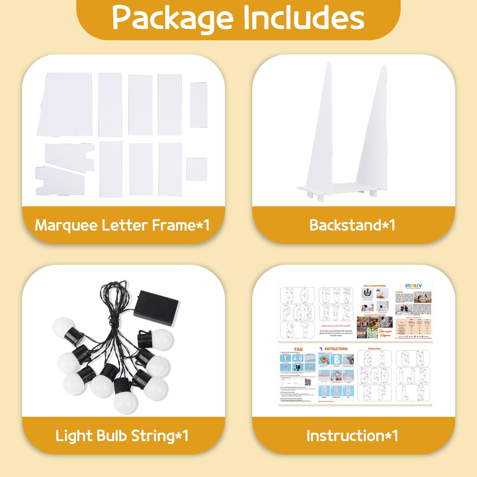 - Q: How do I assemble the marquee letters? A: Assembling the marquee letters is simple. First, match the slots on the pre-cut frames and use hot glue to secure them together. Then, screw in the bulbs and install 3 AA batteries to complete the setup.