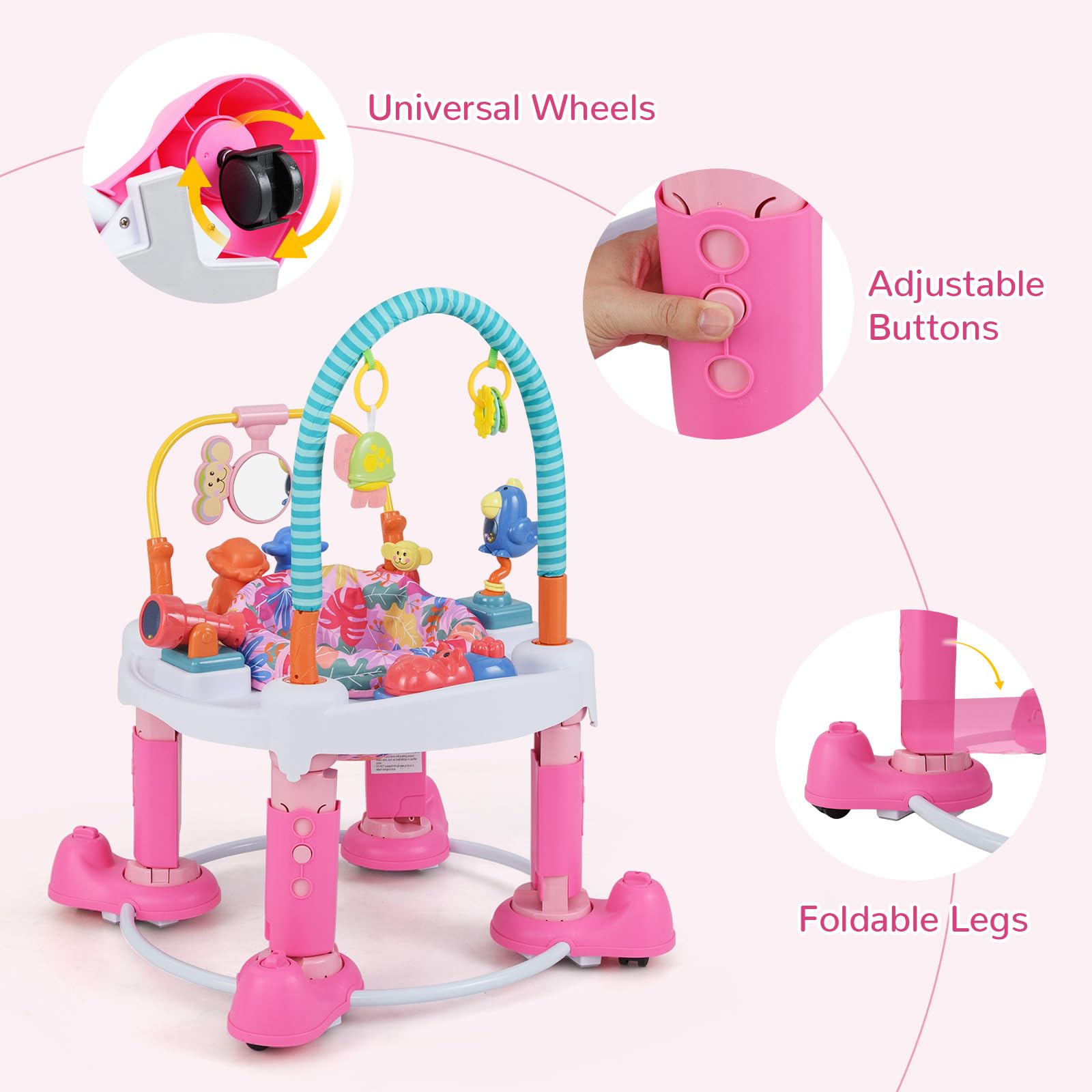 Why do you choose INFANS Baby Activity Center? This 5 in 1 baby activity center is designed to provide versatile and interactive experience for your little one. It can be used as a baby walker, a bouncing saucer or an activity table to accompany baby from 0-24 months. With 3 adjustable height positions, bouncing saucer offers comfortable for your baby at different growth stages. The seat of the jumper is designed to rotate, allowing your baby to access different toys and activities from all angles. Moreover, the play mat is convenient for the baby to sit or lie down. Let your little one to play, learn, and grow. Features: Converted into baby walker, bouncer, play mat and activity table Three heights are adjustable to accommodate baby growth 360 rotatable seat to grab every toy with ease Scientifically exercise your baby 's leg strength and avoid O-shaped legs Folding design for easy storage A variety of toys for your baby to use 4 Anti-collision Angle ensure the safety of the baby Switch fixed or moved using knob device Suitable for babies aged 0-24 months Specification: Color: Gray Material: PP, ABS, Iron Pipe Net Weight: 14 lbs Weight Capacity: 55 lbs Suitable Age: 0-24 Years Old Adjustable Height from Floor to Table Top: 13 -17 Dimension of Walker: 32.5 x 32.5 x 31.5 -34.5 (L x W x H) Dimension of Activity Table: 40 x 23.5 x 28.5 -31.5 (L x W x H) Dimension of Play Mat: 28 x 22 (L x W) Package includes: 1 x Baby Activity Center 1 x Play Mat 1 x Instruction 1 x Hippo 1 x Game Fence 1 x Music Box 1 x Bird 1 x Telescope 1 x Flower 1 x Mirror