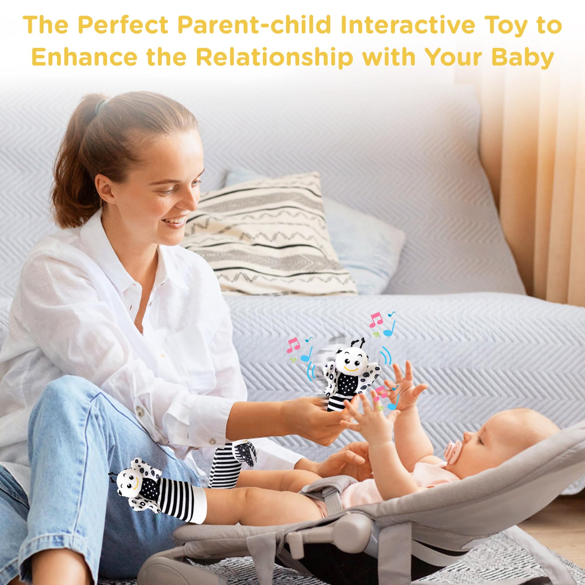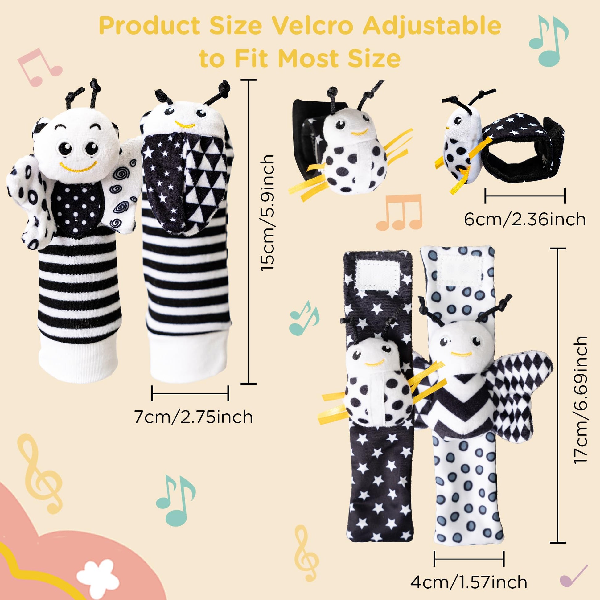 • Q: How do the wrist rattles and foot finders work? A: The wrist rattles and foot finders are equipped with integrated rattles that produce soft sounds when the baby moves or shakes them, helping to engage auditory senses and stimulate curiosity.