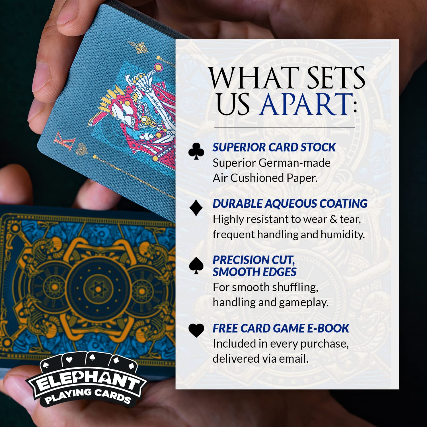 - Q: What makes these playing cards different from regular ones? A: The Elephant Playing Cards feature intricate designs and a durable build. They are crafted for superior handling and visual appeal, setting them apart from standard decks.