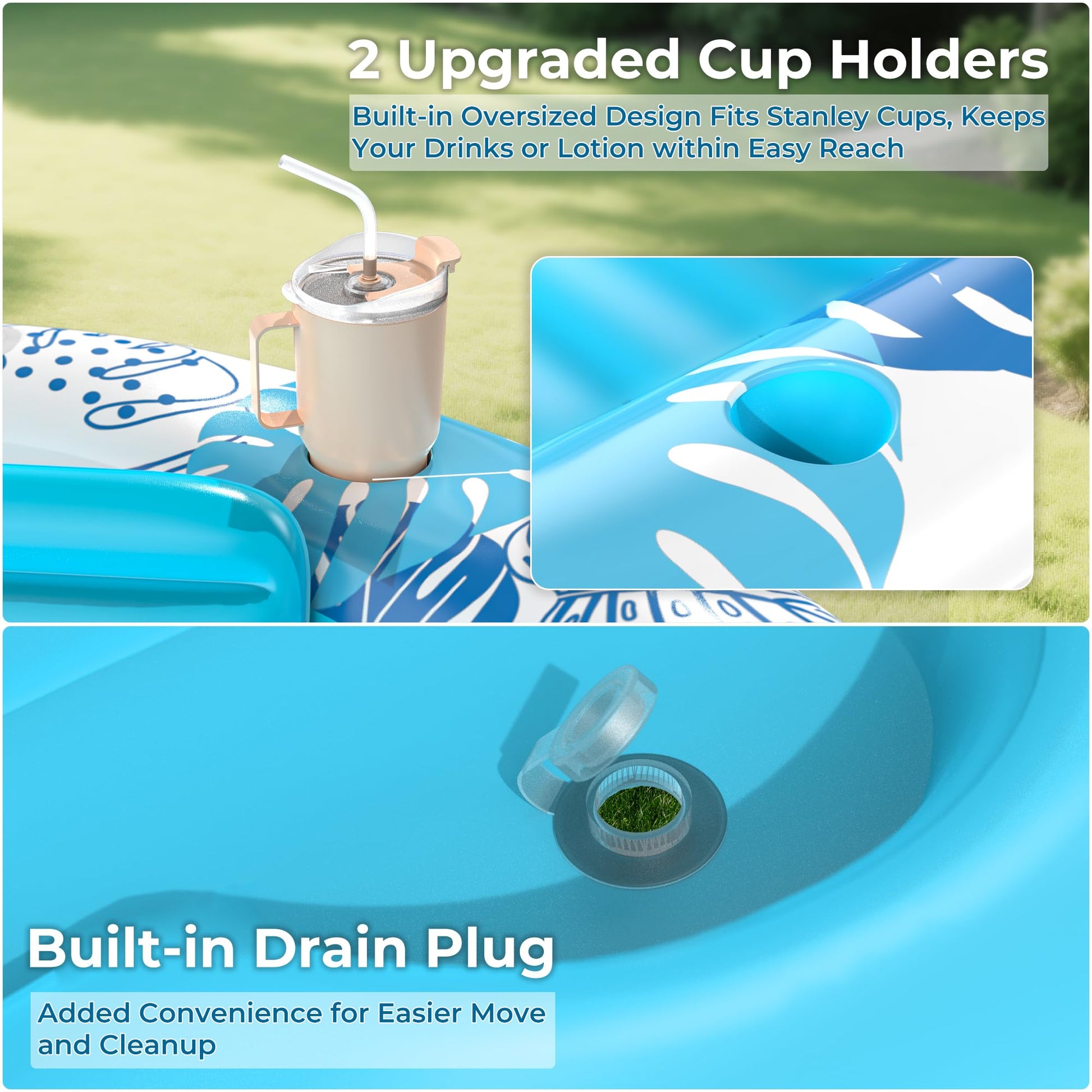 - Q: Are there storage options for drinks and personal items? A: Yes, the lounger features oversized cup holders. They can hold forty-ounce tumblers and provide space for phones and tanning oils.