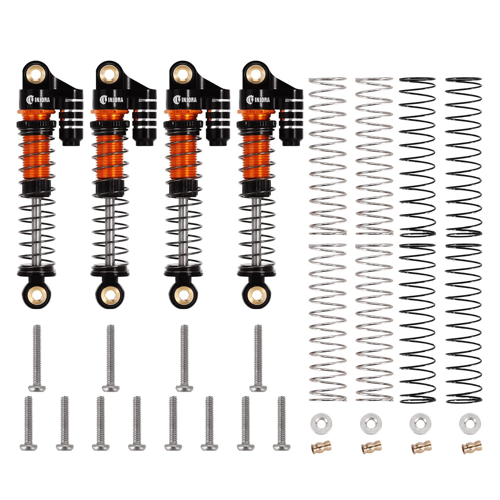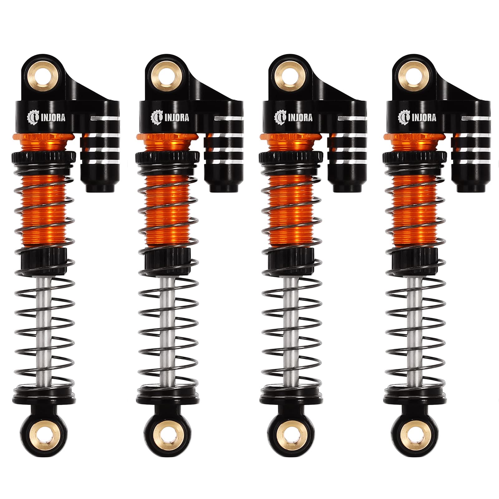 • Q: What are the dimensions of the INJORA shock absorbers? A: The full length of the shock absorbers is 50.5mm (1.99in), the extended length is 45mm (1.77in), and the compressed size is 31mm (1.23in) with a maximum travel of 14mm (0.56in).