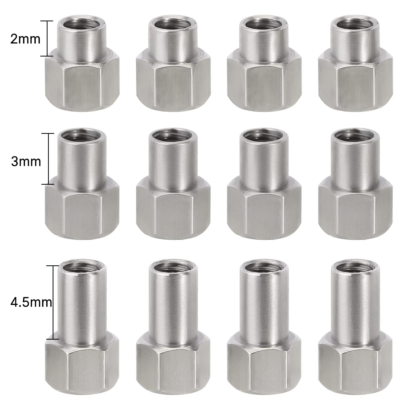 - Q: What are the specifications of the INJORA Long Wheel Nuts? A: The INJORA Long Wheel Nuts are made of stainless steel, providing durability and rust-proof performance. They come in thread sizes of M2.5, with upper lengths of 3mm and lower lengths of 2mm, 3mm, and 4.5mm, resulting in total lengths of 5mm, 6mm, and 7.5mm.