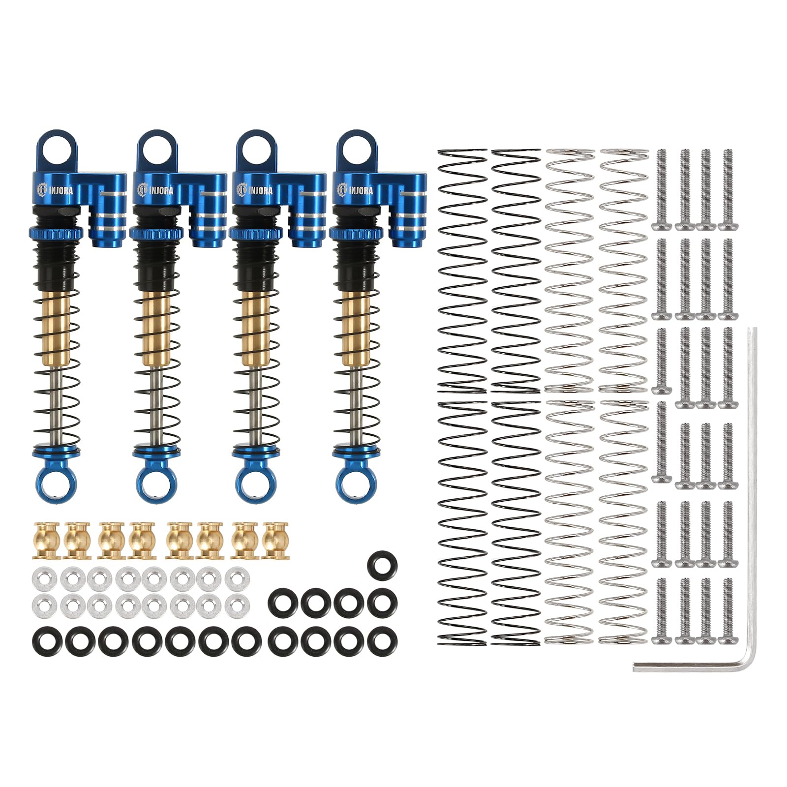 - Q: What are the key features of the INJORA RC 43mm Shocks? A: The INJORA RC 43mm Shocks feature CNC machined aluminum shock bodies for an attractive look, a telescopic design for maximum travel, threaded shock bodies for quick pre-load adjustments, and a scale-looking reservoir for added realism.