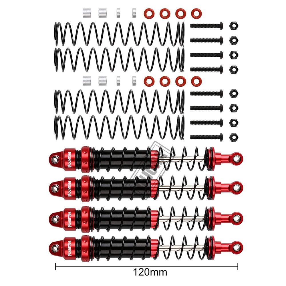 - Q: What dimensions do the shock absorbers have? A: The INJORA RC Shock Absorber Set has a shock body diameter of 18mm, a rod end diameter of 3mm, and a shaft diameter of 4mm. The length between holes is 120mm, and it compresses from 120mm to 88mm.