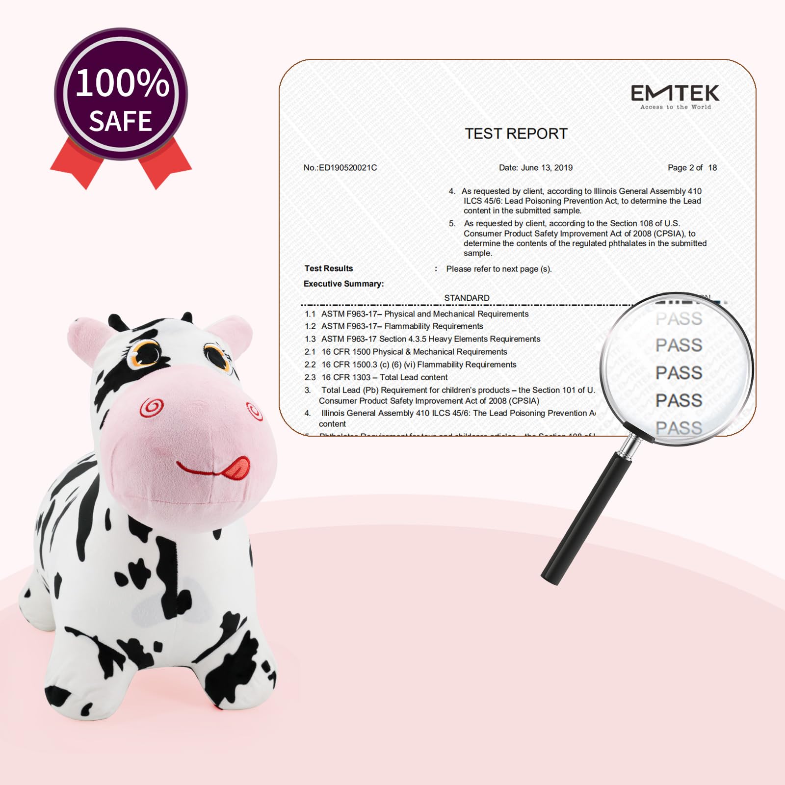 • Q: What materials are used in the construction of the bouncy cow? A: The bouncy cow is made from durable, eco-friendly rubber material, featuring a soft plush cover that is comfortable for children and protects their skin.