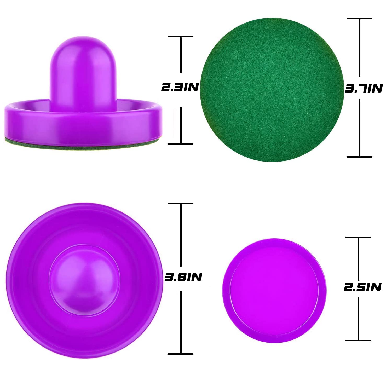 - Q: What are the dimensions of the air hockey pushers and pucks? A: The air hockey pushers measure 3.8 x 2.3 inches, while the pucks have a diameter of 2.5 inches and a thickness of 0.12 inches.