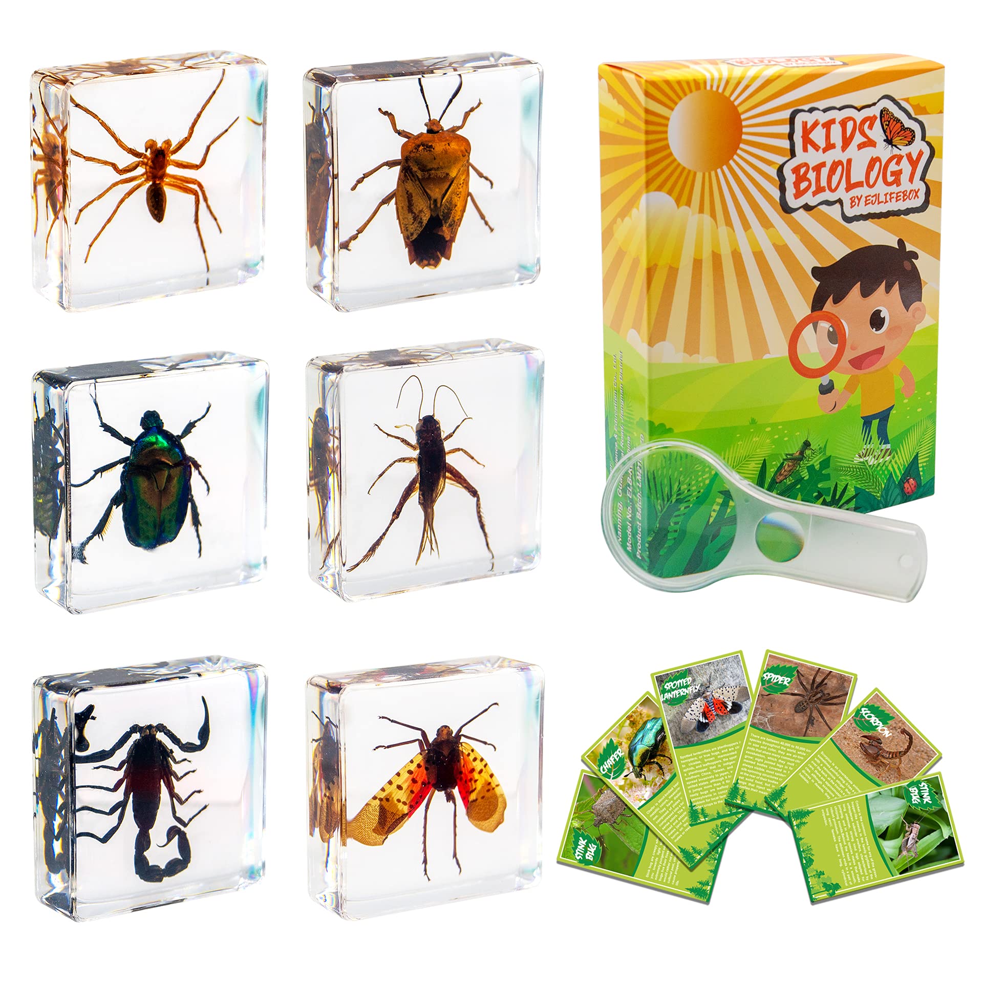 - Q: What insects are included in the Insect Specimen Set? A: The Insect Specimen Set includes six different insects: a spider, scorpion, cricket, chafers, stink bug, and spotted lanternfly, all beautifully mounted in clear acrylic blocks for easy viewing.