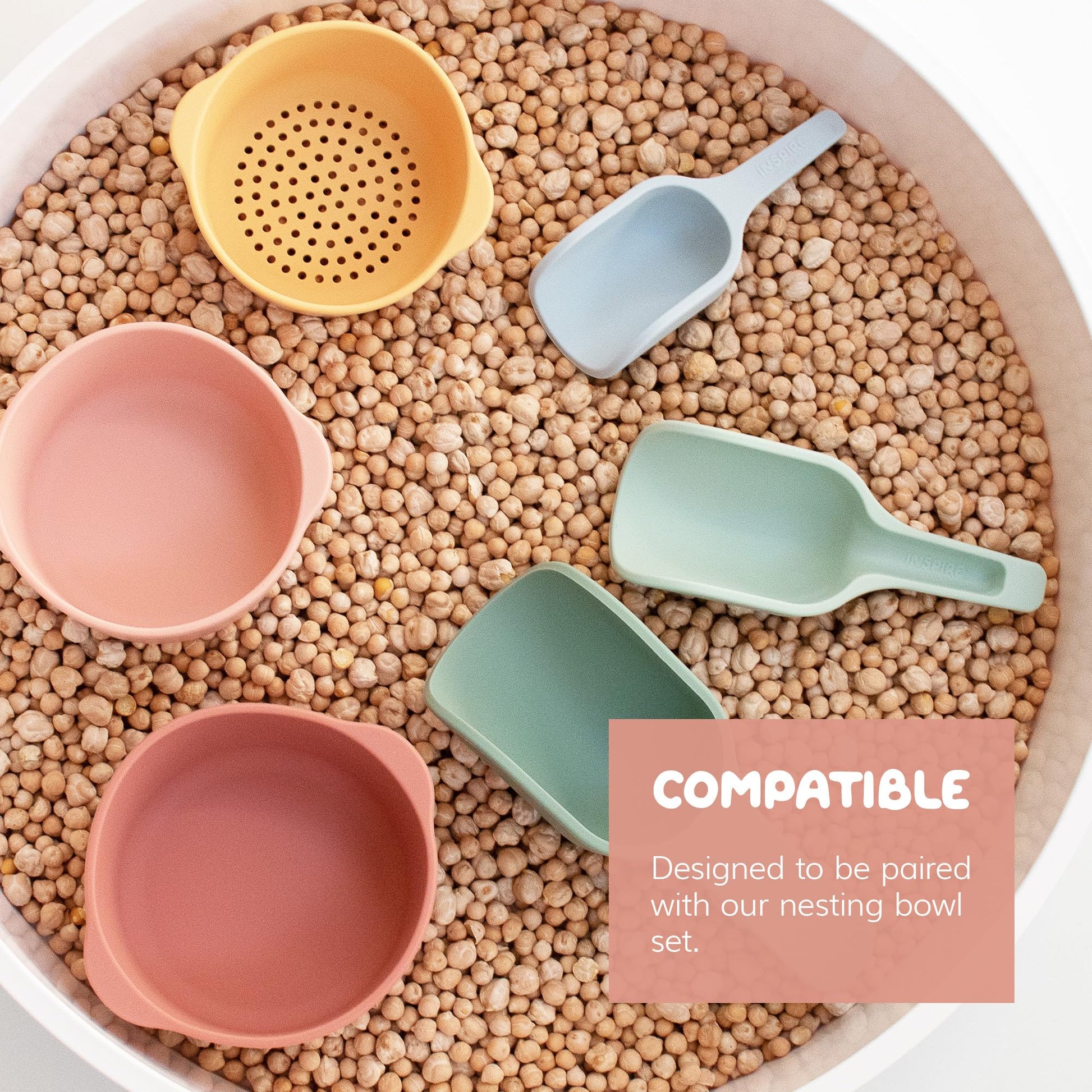 - Q: How do I clean the silicone nesting scoops? A: The Inspire My Play silicone nesting scoops are dishwasher safe, making them easy to clean after playtime. Simply place them in the dishwasher for convenient cleaning.