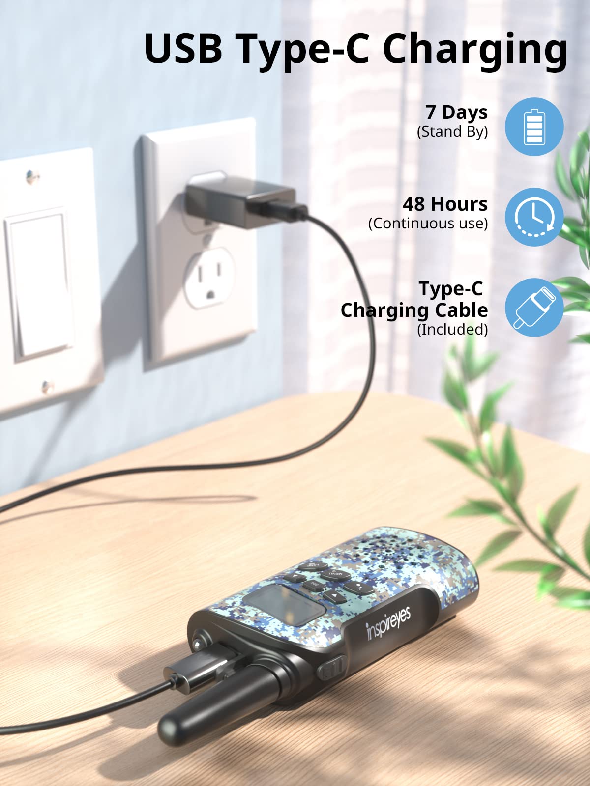 • Q: What is the battery life of the Inspireyes Walkie Talkies? A: The Inspireyes Walkie Talkies are rechargeable and provide an impressive working time of up to 48 hours, along with a 7-day standby time, making them ideal for extended outdoor use.