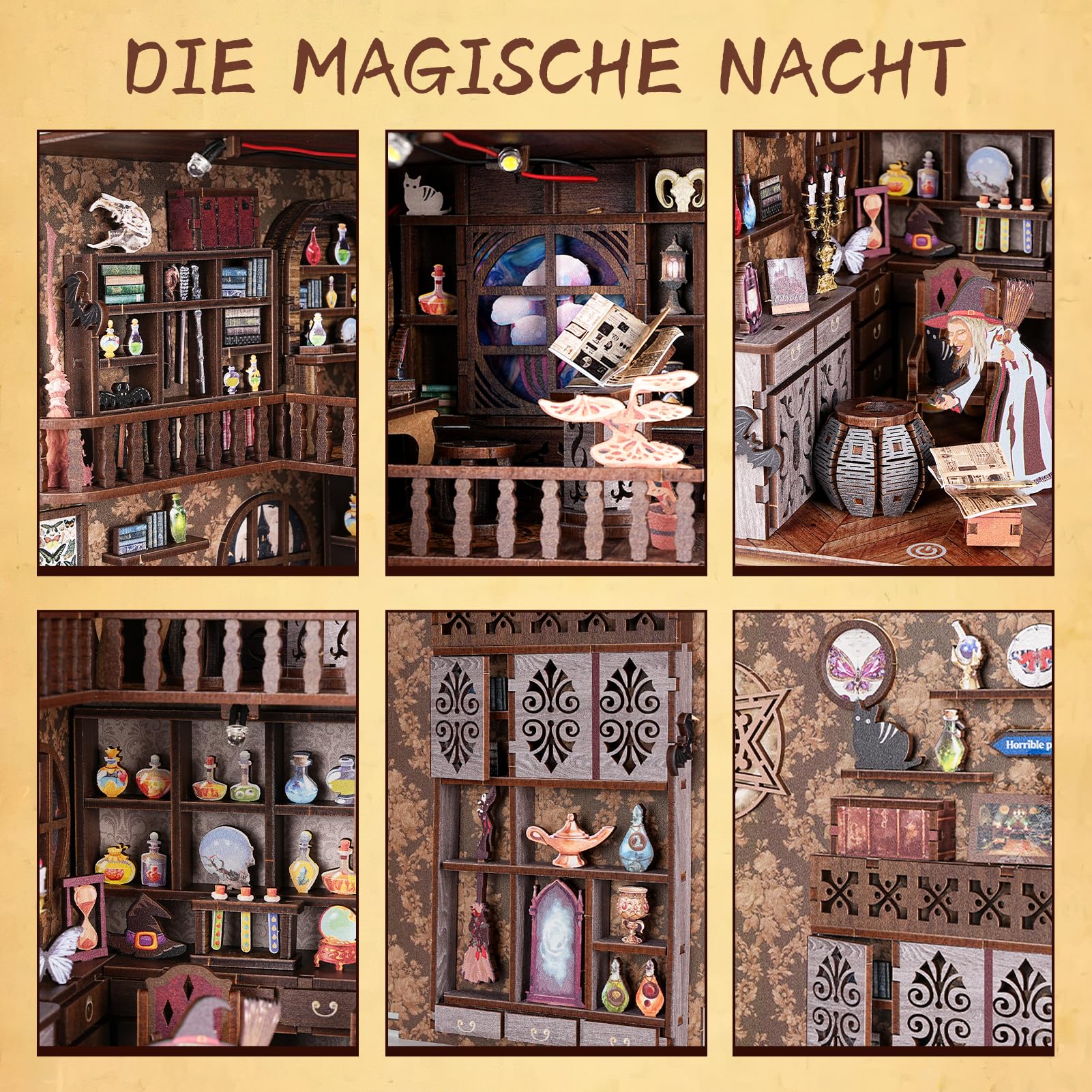 Magic Night Book Nook Dollhouse Kit: Magic Night Book Nook Dollhouse Kit Contains Realistic Miniature Furniture, With A Highly Reproducible Attic Top And Bottom Design, Showcasing The Interior'S Rich Modelling Design And Sky-High Spatial Structure Through The Corner Staircase And Skeleton Fence. It Is Assembled From Small Parts, Which Helps To Develop Logical Thinking Skills And Exercise Hands-On Skills In The Process.