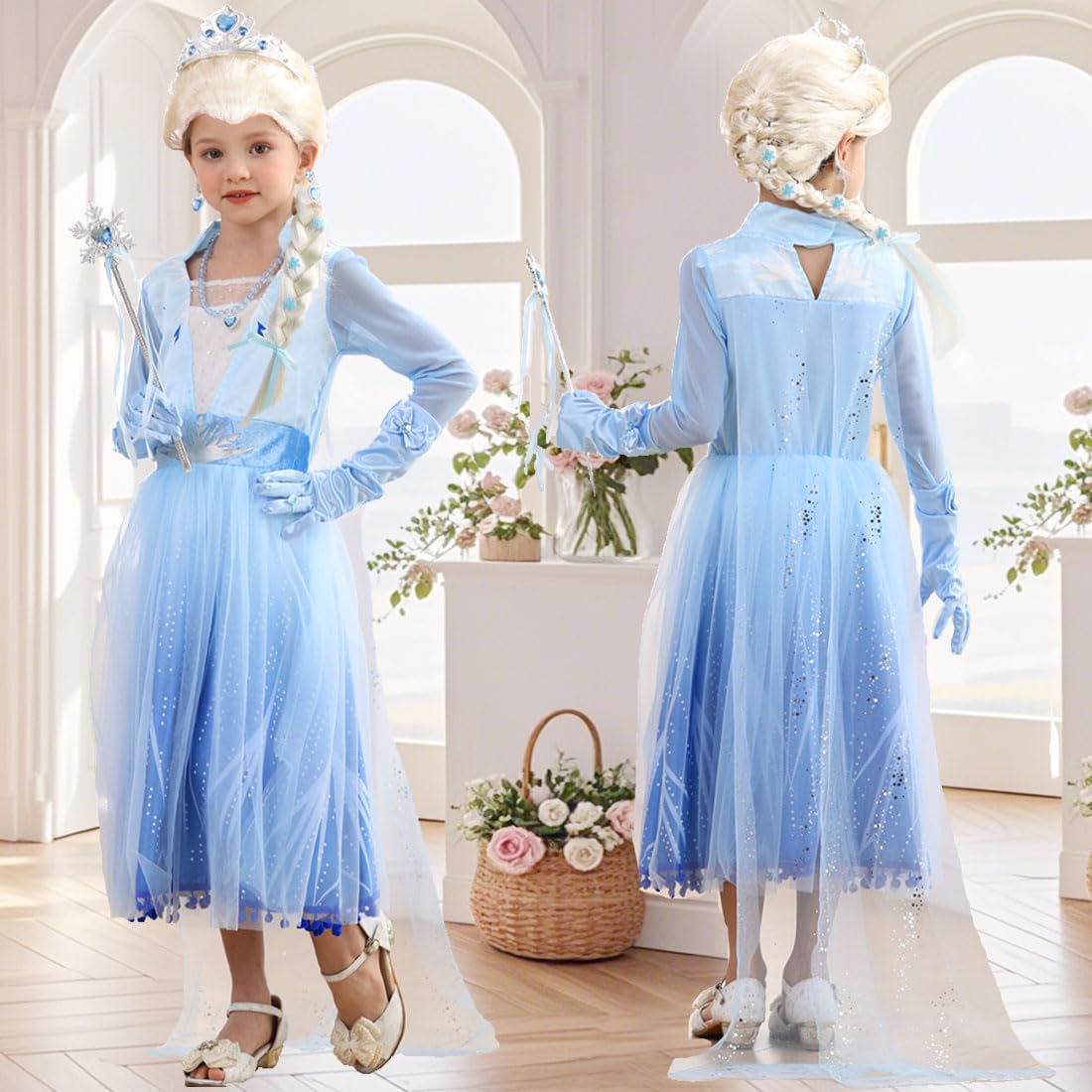 Package Includes: 1*Blue Long Sleeve Elsa Princess Dress, 1*Wand, 1*Ring, 1*Crown, 1*Pair Of Earrings, 1*Necklace, 1*Gloves, 1*Wig, 1* Hairnet. Rich Accessories Allow Little Girls To Immerse Themselves In The Joy Of Role-Playing. | Cotton Lining: Made With A Cotton Lining And Polyester Fabric, Ensuring A Soft And Comfortable Fit For Hours Of Fun And Play. | Details: Designed With Semi-Sheer Mesh Long Sleeves And A Long Cape, This Blue Dress Will Make Her Feel Like Stepping Into A Fairytale World. It Has A Magic Tape Closure At The Back Neck For Easy Wear. The Floor-Length Cape Adds A Touch Of Elegance, While The Small Blue Pom-Pom Accent At The Hem Adds A Touch Of Playfulness. The Blue Belt Design At The Front Of The Waist Accentuates Her Figure And Adds An Air Of Style And Elegance. | Applicable Occasions: Perfect For Halloween, Christmas, Carnival, Birthday Parties, Theme Parties, And Role-Playing, This Blue Elsa Costume Will Ignite Their Imagination And Bring Their Favorite Characters To Life. | Nice Gift: Princess Dress Is The Dream Of Every Little Girl. It Will Be A Delightful Surprise Gift For Little Girls Who Will Jump For Joy When They See It.