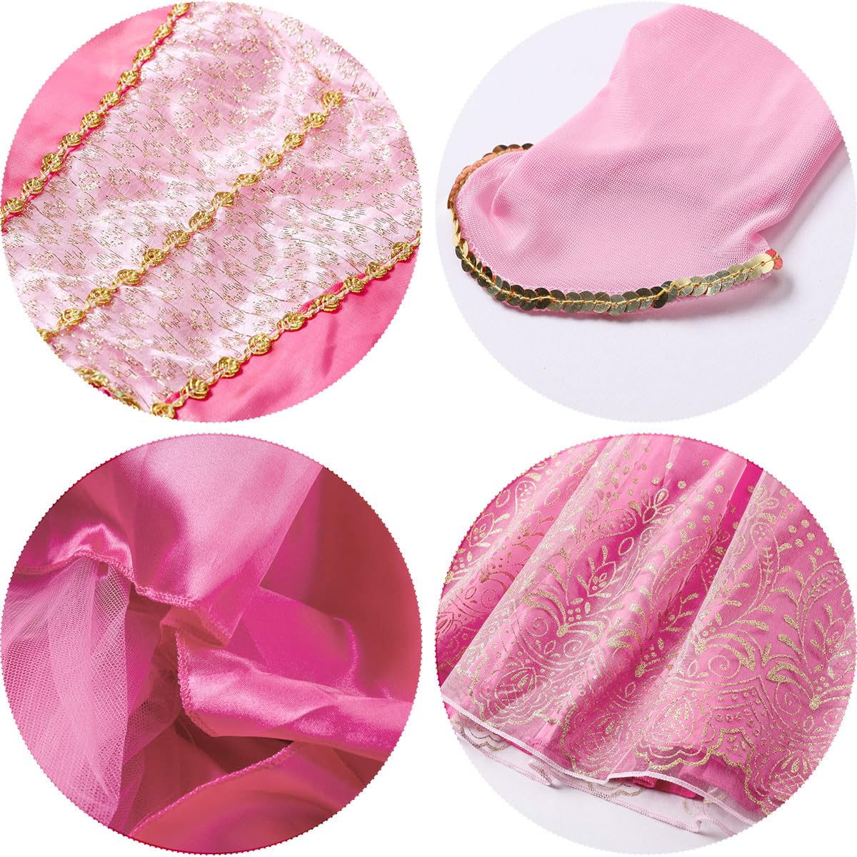 Made From Polyester, 100% Cotton Lining, Soft And Comfy. | Princess Costume Includes: Dress With Gloves, Crown Tiara, Necklaces, Wands, Earrings, Ring. | Voile Sleeve With Sequin Cuffs. | Elastic Waist Closure With Gold Lacework. | Great For Halloween, Christmas, Carnivals, Birthday, Parties.