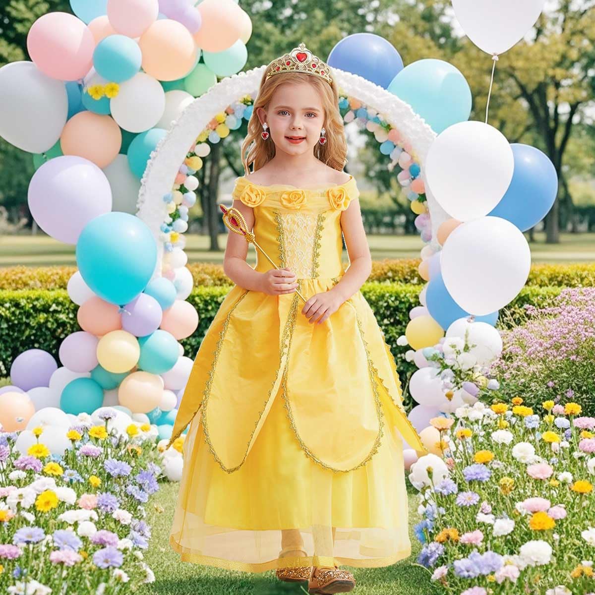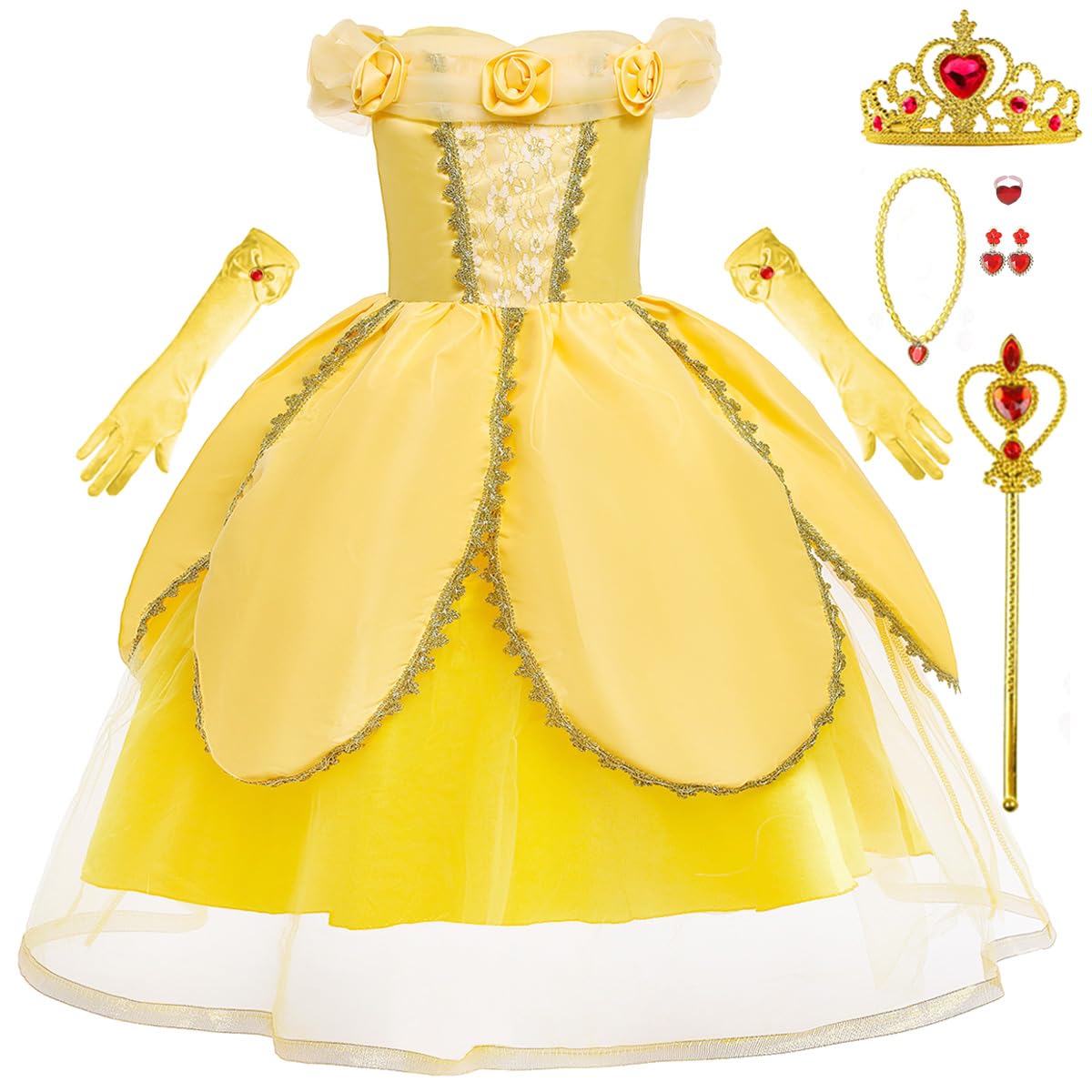 Itvti Princess Belle Dress Up Costume For Girls Yellow Dresses Halloween Cosplay Birthday Outfit With Accessories, Yellow, 7-8 Y