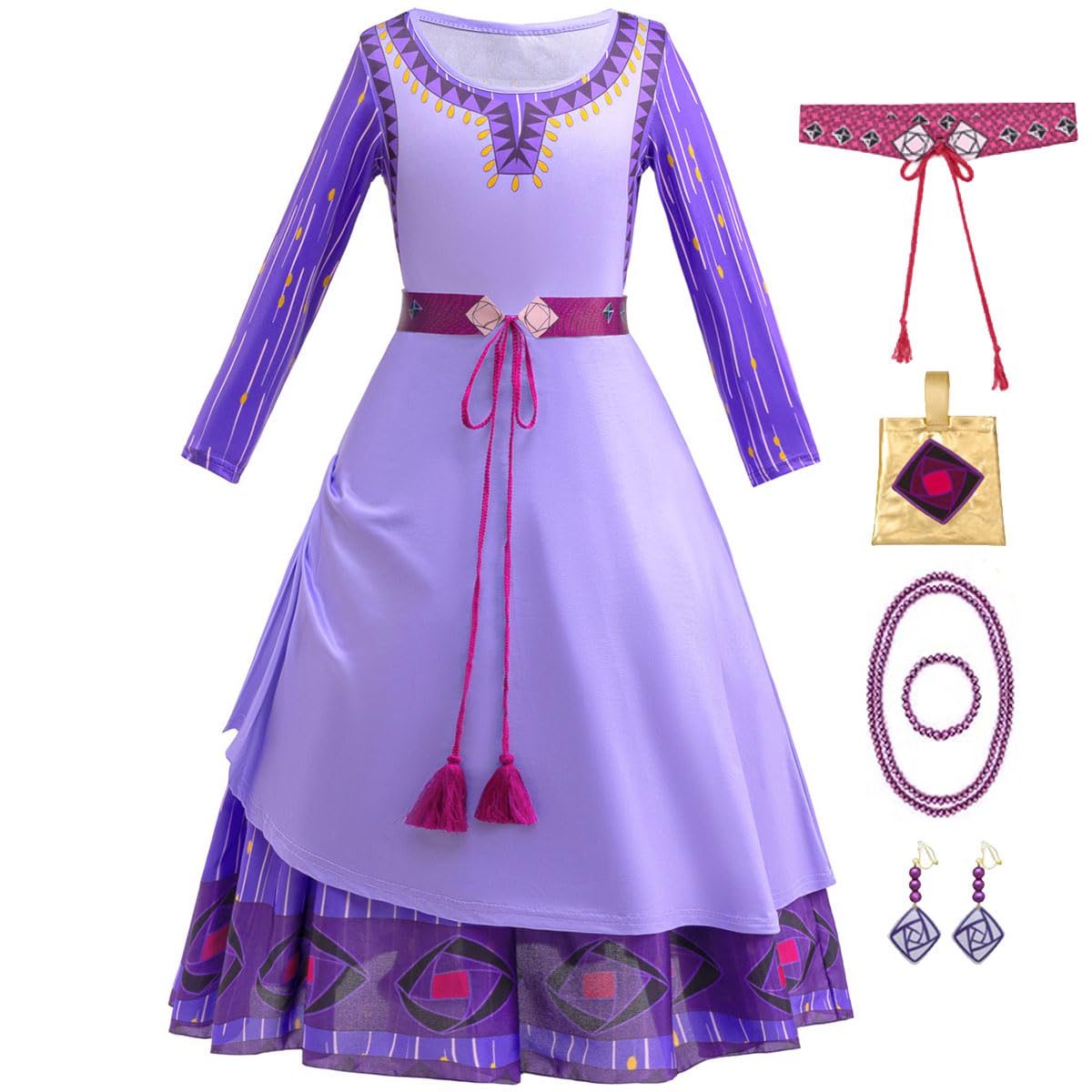 - Q: What accessories are included with the costume? A: The package includes a purple long sleeve dress, a belt, a belt bag, necklaces, a bracelet, and a pair of ear clips, providing a complete Asha-themed look.