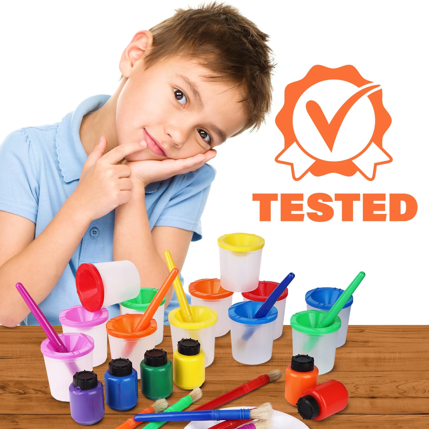 J Marks All Inclusive 43-Piece Kid Paint Set Includes:6 Wide Mouth Finger Paints in Blue, Purple, Red, Orange, Yellow and Green (2 oz/60 mL each)11 Painting Tools12 No Spill Paint Cups for Kids (2 of each in Red, Orange, Yellow, Pink, Blue & Green; 150 mL each)12 Matching Kids Paints Brushes (2 of each in Red, Orange, Yellow, Pink, Blue & Green; 7