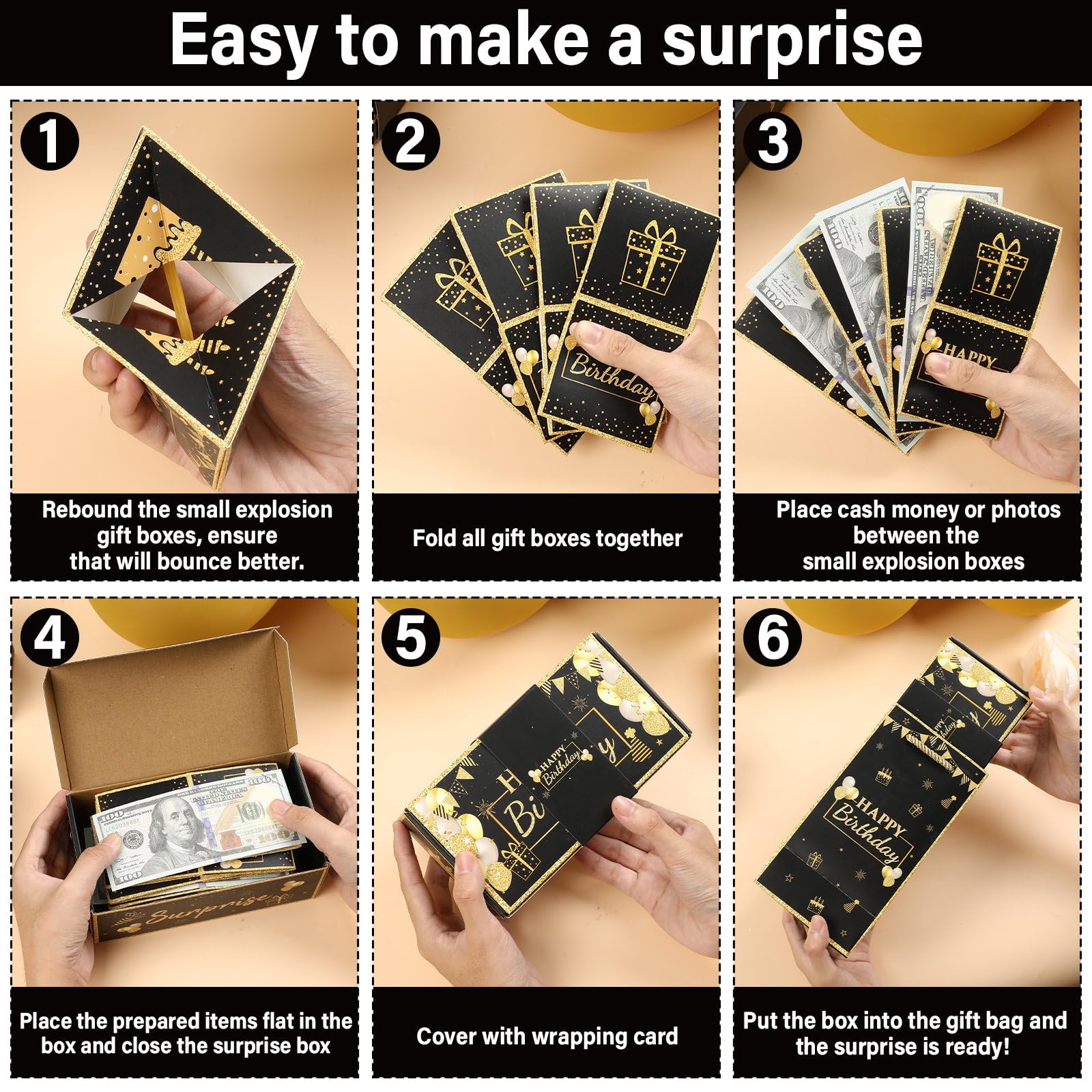 - Q: How do you use the exploding gift box for a surprise? A: To use the exploding gift box, simply insert cash, cards, or small gifts into the gaps between the bouncing boxes. Once filled, place them inside the gift box, secure it with the wrapped card, and finally, put the entire gift box into the gift bag for a delightful presentation.