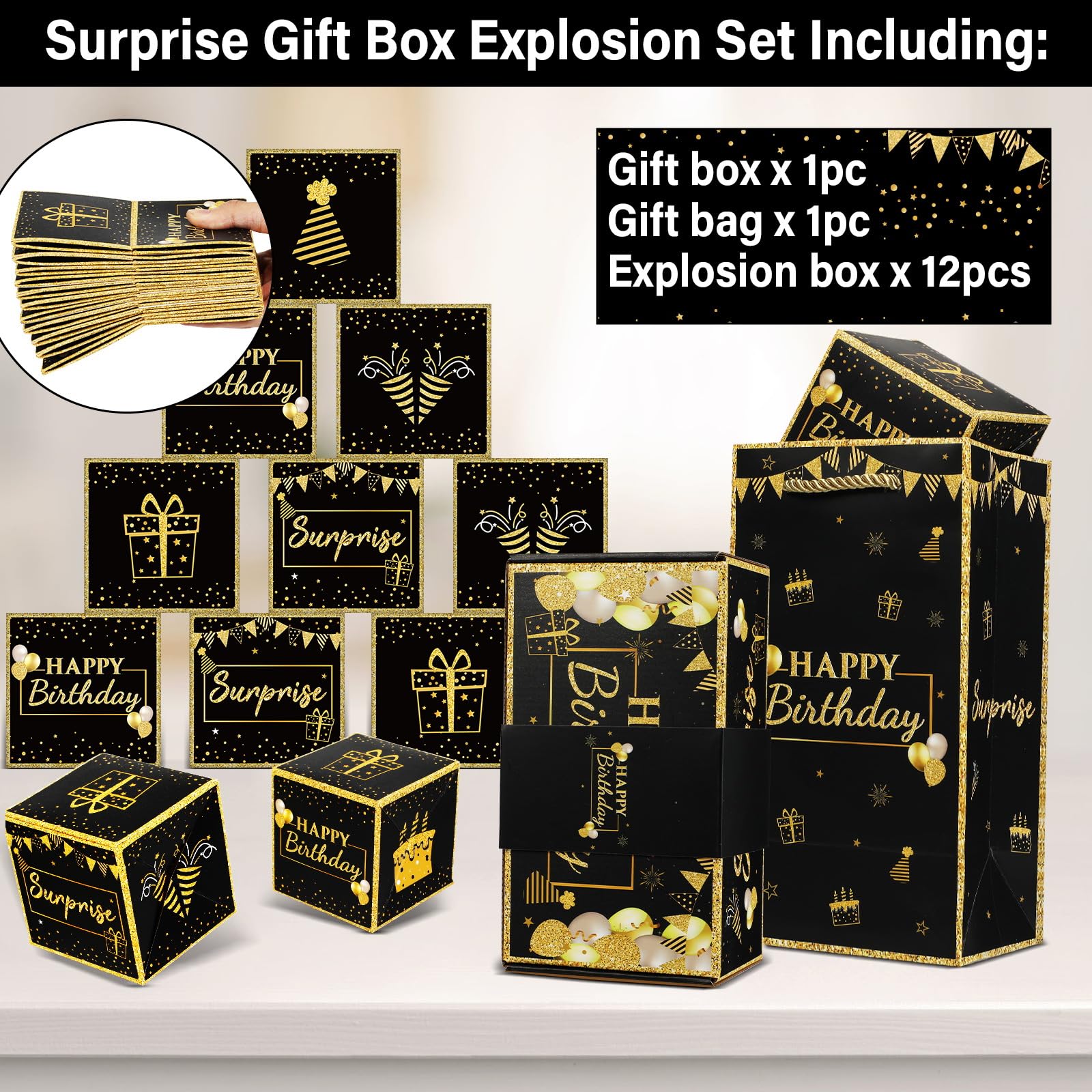 - Q: What is included in the Jacyan Surprise Gift Box Explosion? A: The Jacyan Surprise Gift Box Explosion includes 1 gift bag, 1 gift box, 12 surprise bouncing boxes, and 1 wrapped card. This comprehensive set is designed to create a memorable surprise experience for birthdays or special occasions.