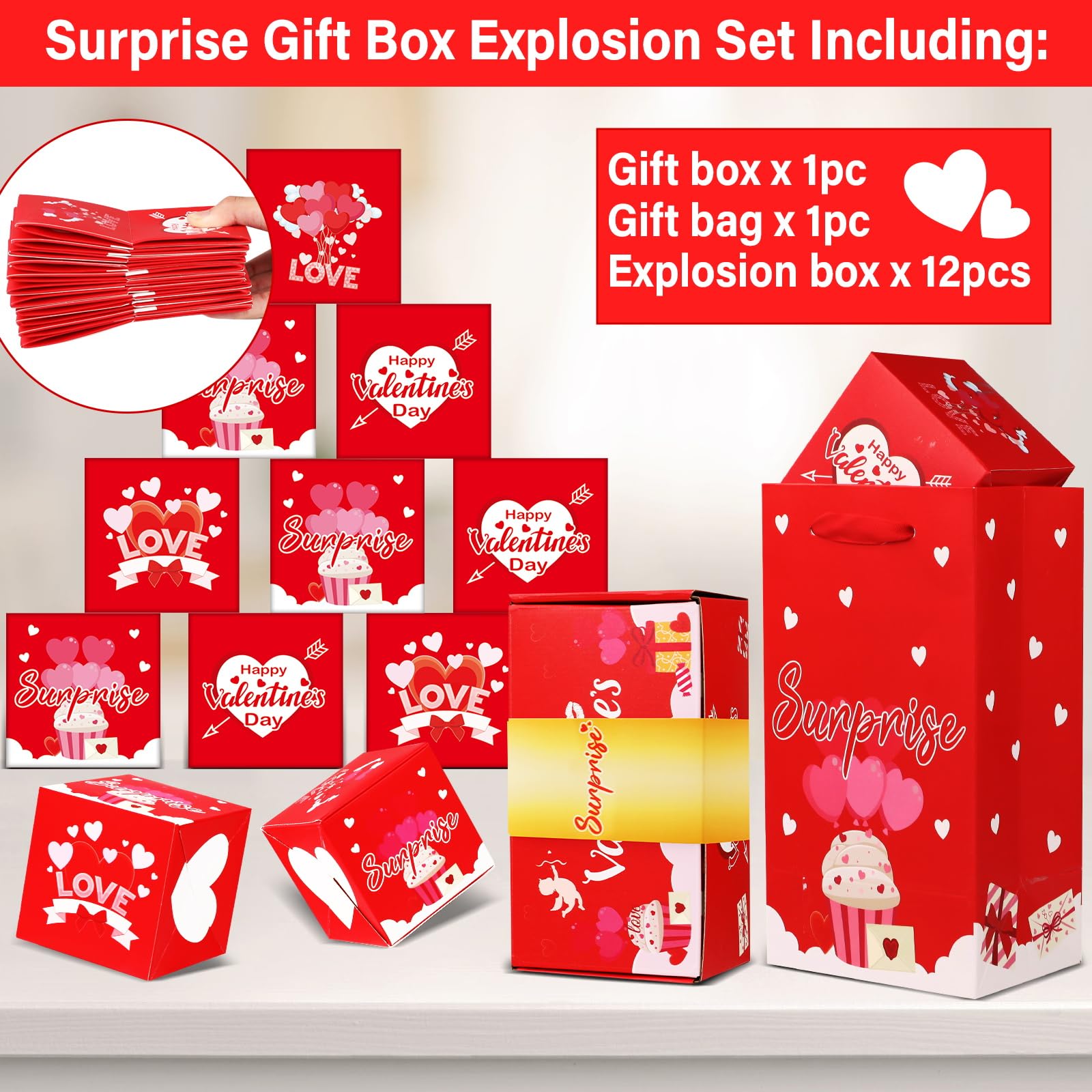 Happy Valentine'S Day Surprise Box, Unique Pink And Red Gift Boxes Set, Surprise Gift Box Explosion Cute Exploding Box Out Bounce Boxes For Valentine'S Day Package Includes: 1 Piece Gift Box Bag, 1 Piece Gift Box, 12 Pieces Small Explosion Boxes, 1 Piece Package Wrapped Card Color: Pink Material: Paper Package Dimensions: 12X11X0.8 Inches/ 30.5X28X2 Cm The Funny With This Box, The Perfect Gift For Valentine'S Day. Its Delightful Designs Bring Surprise And Smiles To Your Loved Ones, Conveying Your Love And Care In A Unique And Memorable Way. Our Box Boasts A Funny Design That Will Leave Your Lover Surprised. The Faster You Open It, The Higher The Gift Out, Adding Fun To The Occasion. Ideal For Hiding Small Items. Our Gift Box Will Bring Happy And Unforgettable Moments For You.
