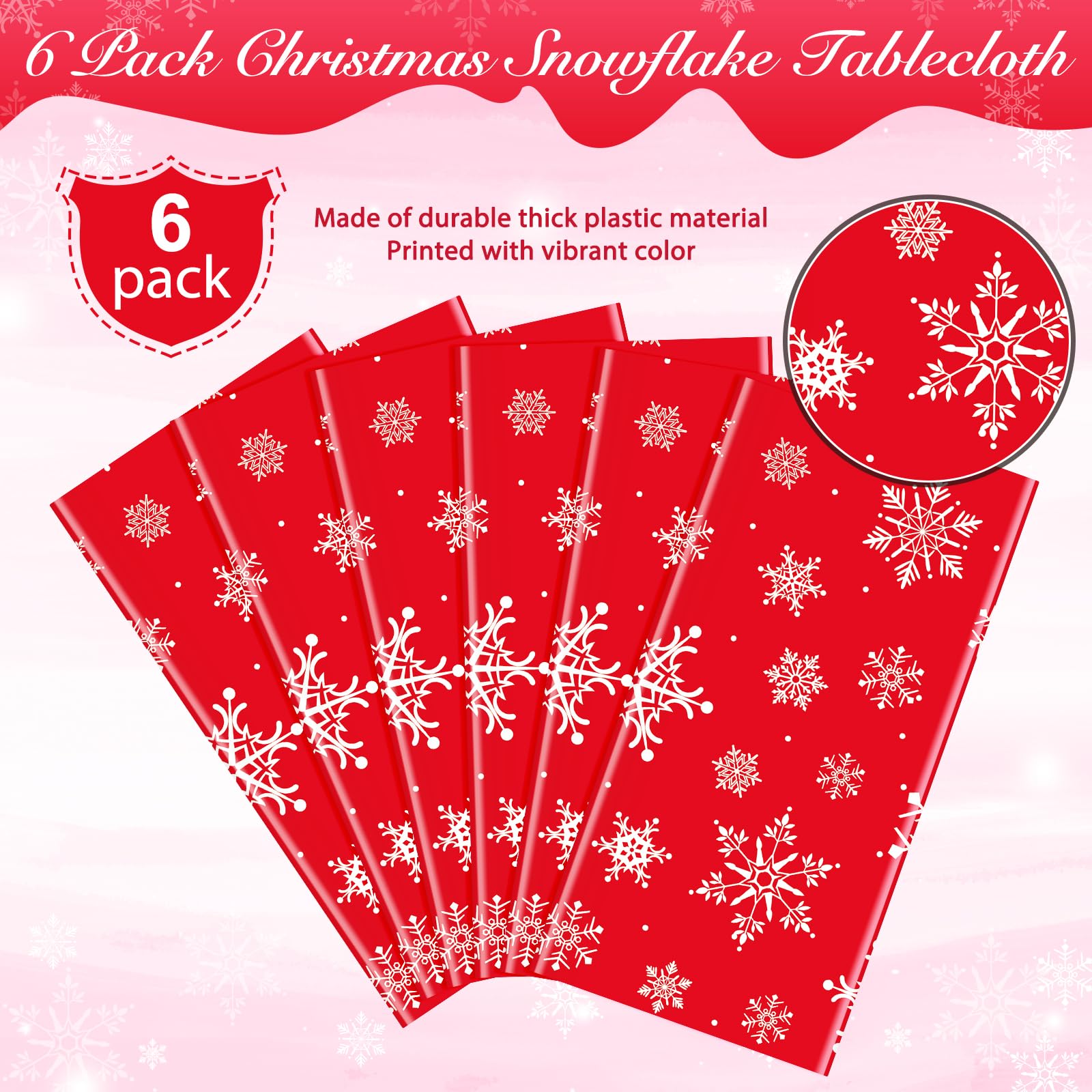 6 Pieces snowflake Christmas party tablecloth decorations,plastic white snowflake red Xmas backdrop sign table cover banner for winter holiday Christmas party supplies,54x108 inch,red color Extra large size: These red snowflake Christmas party tablecloth measures approx. 137x274cm/54X108 inch, which fits for 8 feet long tables that can accommodate 8-10 people, Its large enough for your to hold a winter holiday and Christmas theme party with your family and friends to share happiness Durable material: Made of quality thick plastic material, which is non-toxic and safe for kids and adults; Meanwhile, the tablecloths are lightweight , Waterproof ,Spillproof Stain Resistant, they can effectively keep your tables clean, and can protect your tables from scratches Easy to clean: the white snowflake Christmas table cover with red background has a smooth surface, you just need to wipe the table cover to clean it, then store it for next time or just toss it away,its great value for saving your time for cleaning after parties or decoarte during the parties Wide application: These snowflake table covers are suitable for both indoor and outdoor use, you can hang them up on doors or walls for use as decorative backdrops or put them across the room as banners, easy to clean up after parties. Or just toss them away or simply wipe down and store for next time. Package includes: 6 x Plastic snowflake Christmas tablecloth Warm note: Manual measurement, please allow slight errors on size. The colors may exist slight difference due to different screens.