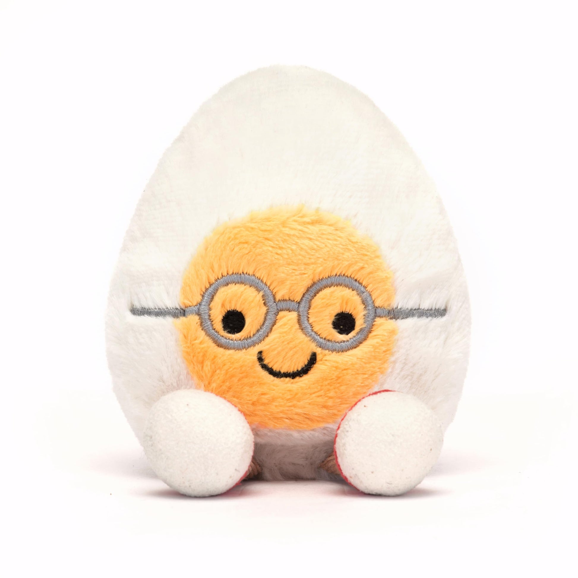 Amuseable Boiled Egg Geek is soft and sweet in cream and yellow fur. With grey stitched glasses and textured red and white shoes this smiley egg is the perfect study buddy.