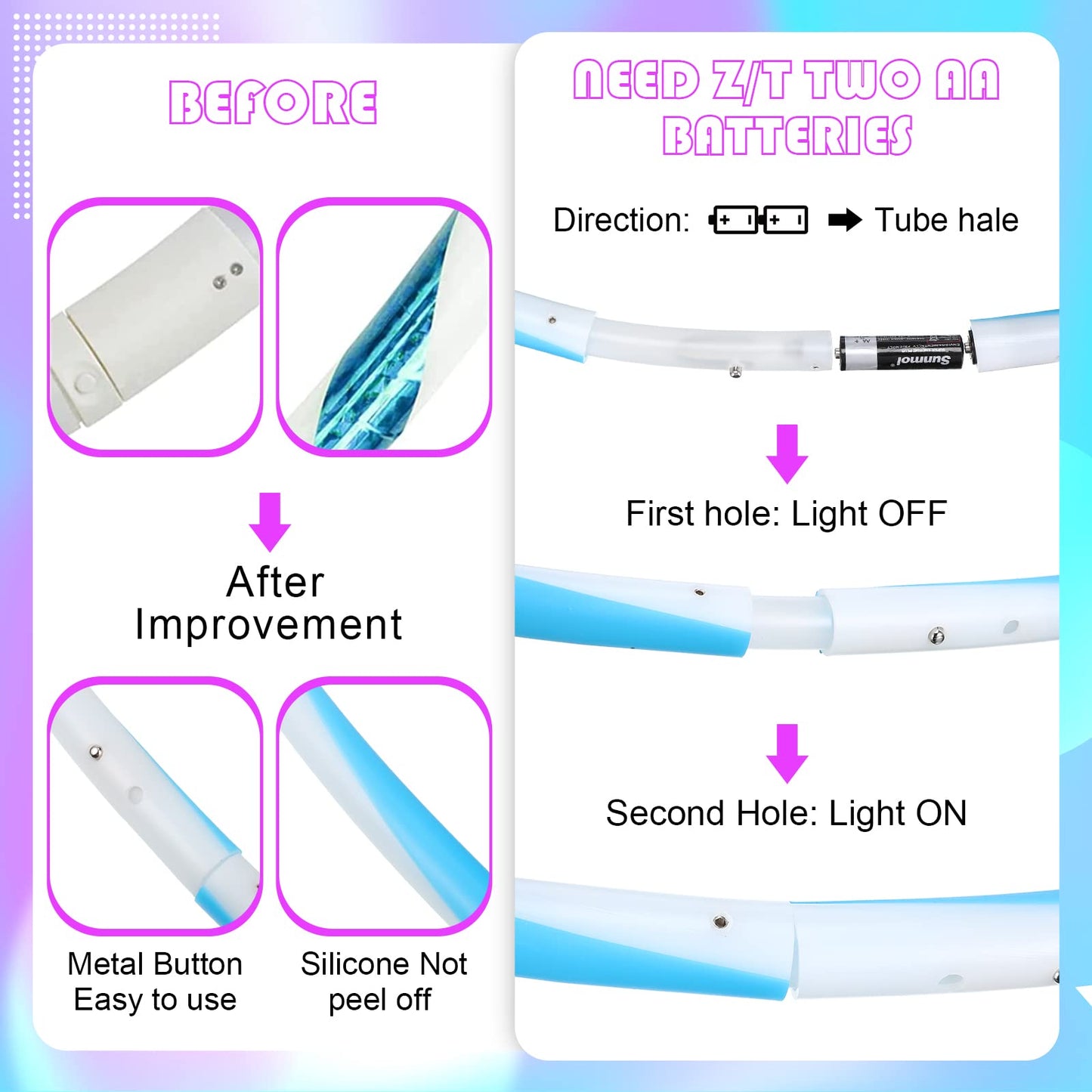 - Q: How do I power the LED lights in the hoop? A: The LED lights in the Jerify hoop require 2 AA batteries for operation, which are not included in the package. The improved metal buttons allow for easy on and off functionality.