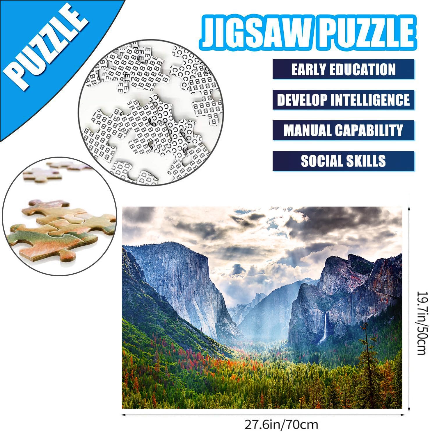 - Q: What is the size of the completed jigsaw puzzle? A: The completed jigsaw puzzle measures 27.56 inches by 19.69 inches (70 cm x 50 cm), providing a substantial size for display or family activities.