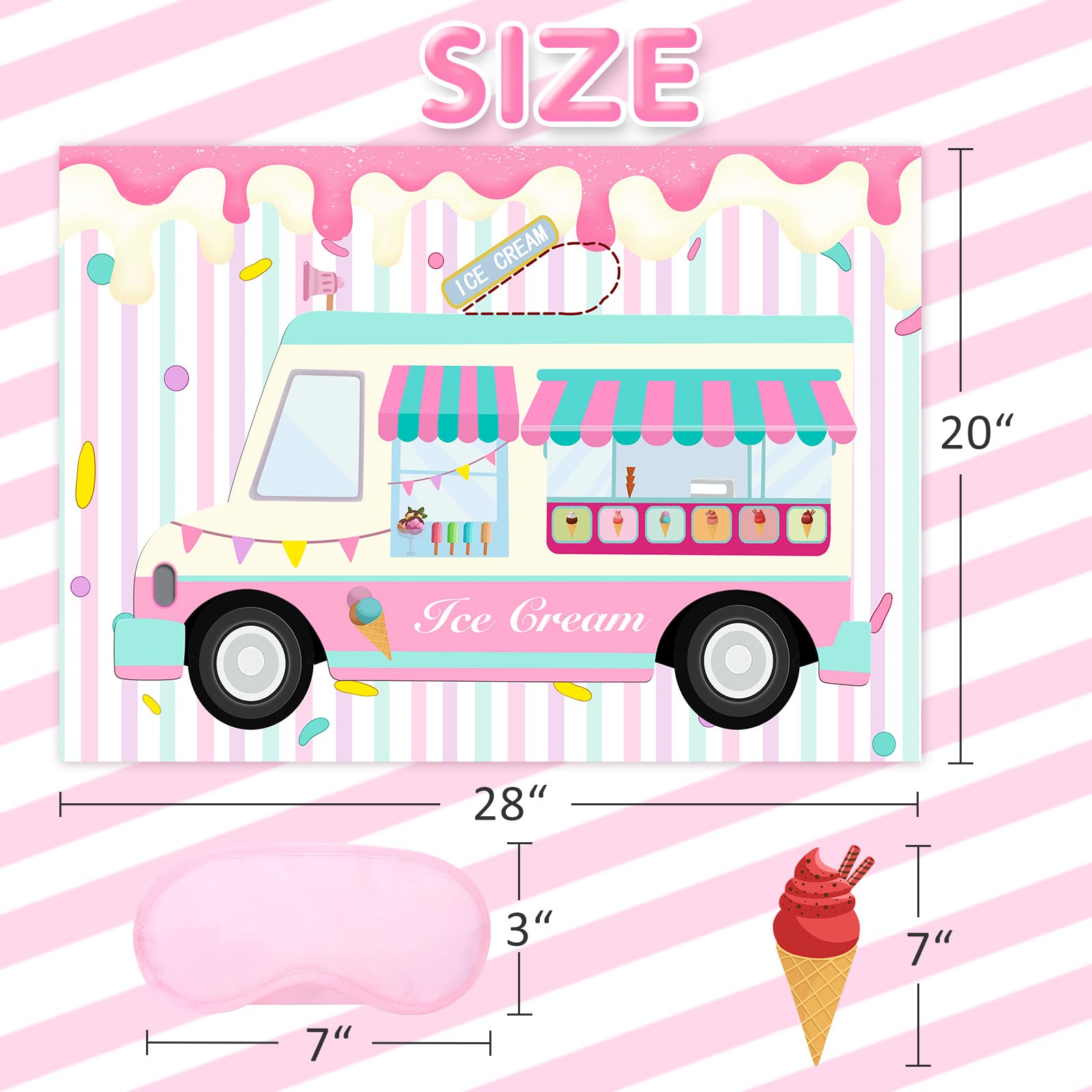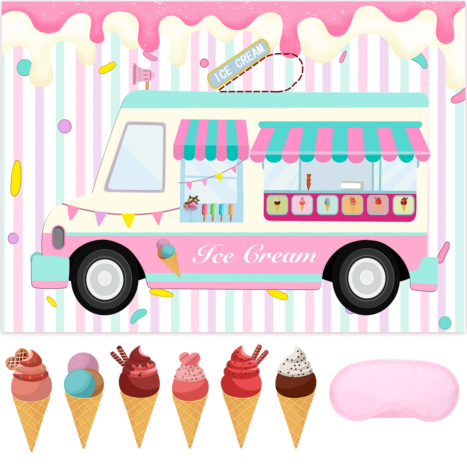 - Q: What is included in the Pin the Ice Cream on the Ice Cream Truck Shop game? A: The game includes a large 20" x 28" ice cream truck shop poster, 24 reusable ice cream stickers, 1 blindfold, and 20 glue dots for easy setup.