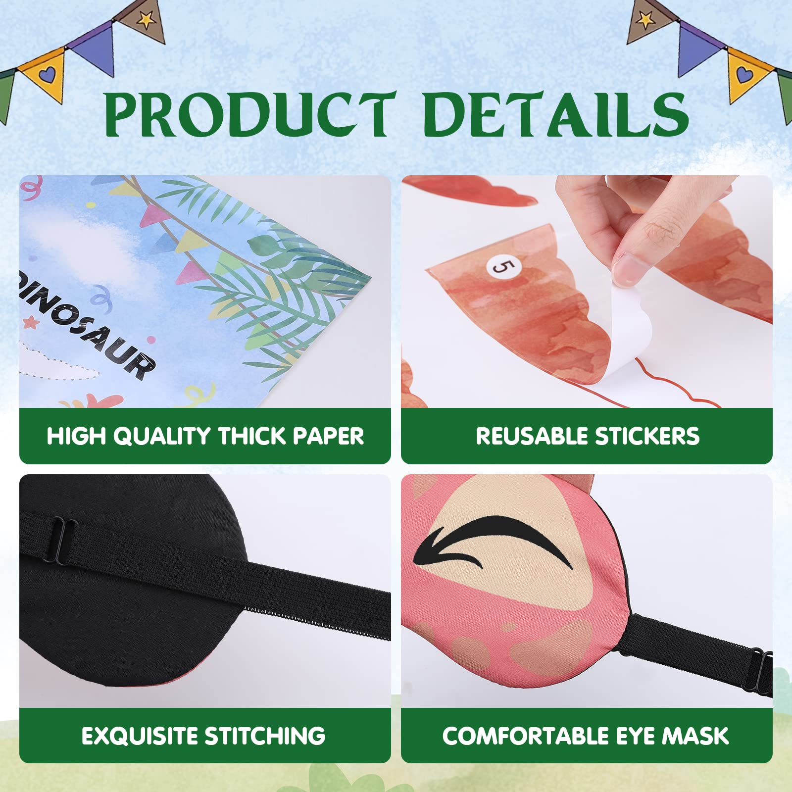 - Q: Is the dinosaur poster reusable for future parties? A: Yes, the large 20'' x 28'' dinosaur poster is made of thick copperplate paper, making it sturdy enough for repeated use. After the game, you can even use it as a decorative piece in a child's room.
