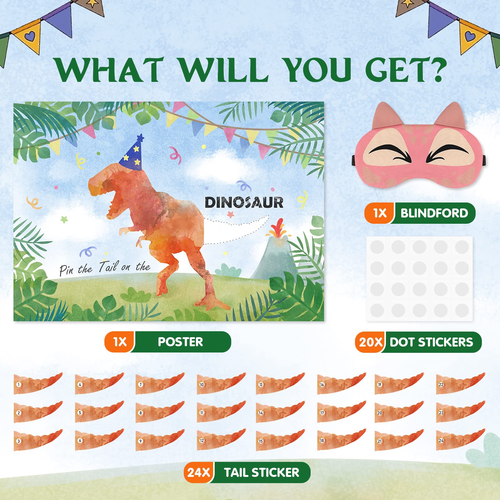 - Q: How do you set up and play the Pin The Tail on The Dinosaur game? A: To set up, paste the dinosaur poster on a wall using the included glue dots. Players wear the blindfold, take a tail sticker, and attempt to pin it on the dinosaur while blindfolded. The player who gets closest to the correct spot wins!