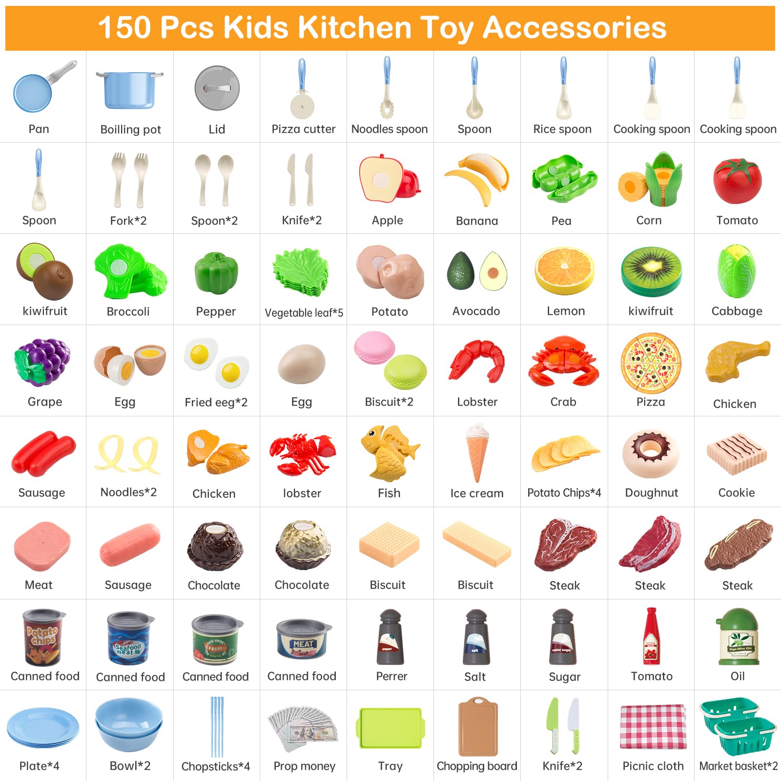 - Q: What items are included in the 150-piece kitchen playset? A: The playset includes a variety of items such as play pots and pans, a kettle, bowls, plates, chopsticks, toy kitchen cookware, and a range of pretend cuttable food items like fruits and vegetables, along with two shopping storage baskets and play money.