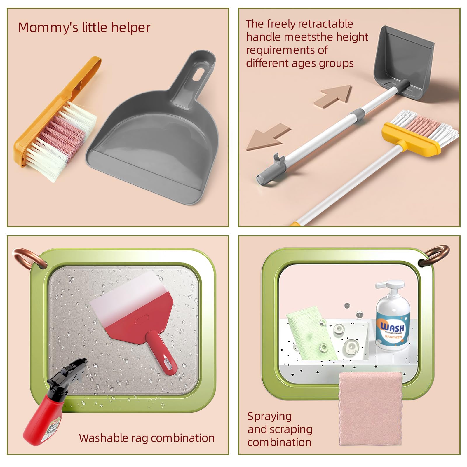 Specially designed for kids, with perfect size, and is suitable for kids to easily grasp and handle. Including vacuum cleaner, broom, dustpan, brush, hanging bracket, towel, sponge, spray bottle, scraper, trash can, wet floor sign and cart, everything is realistic and fully functional.
