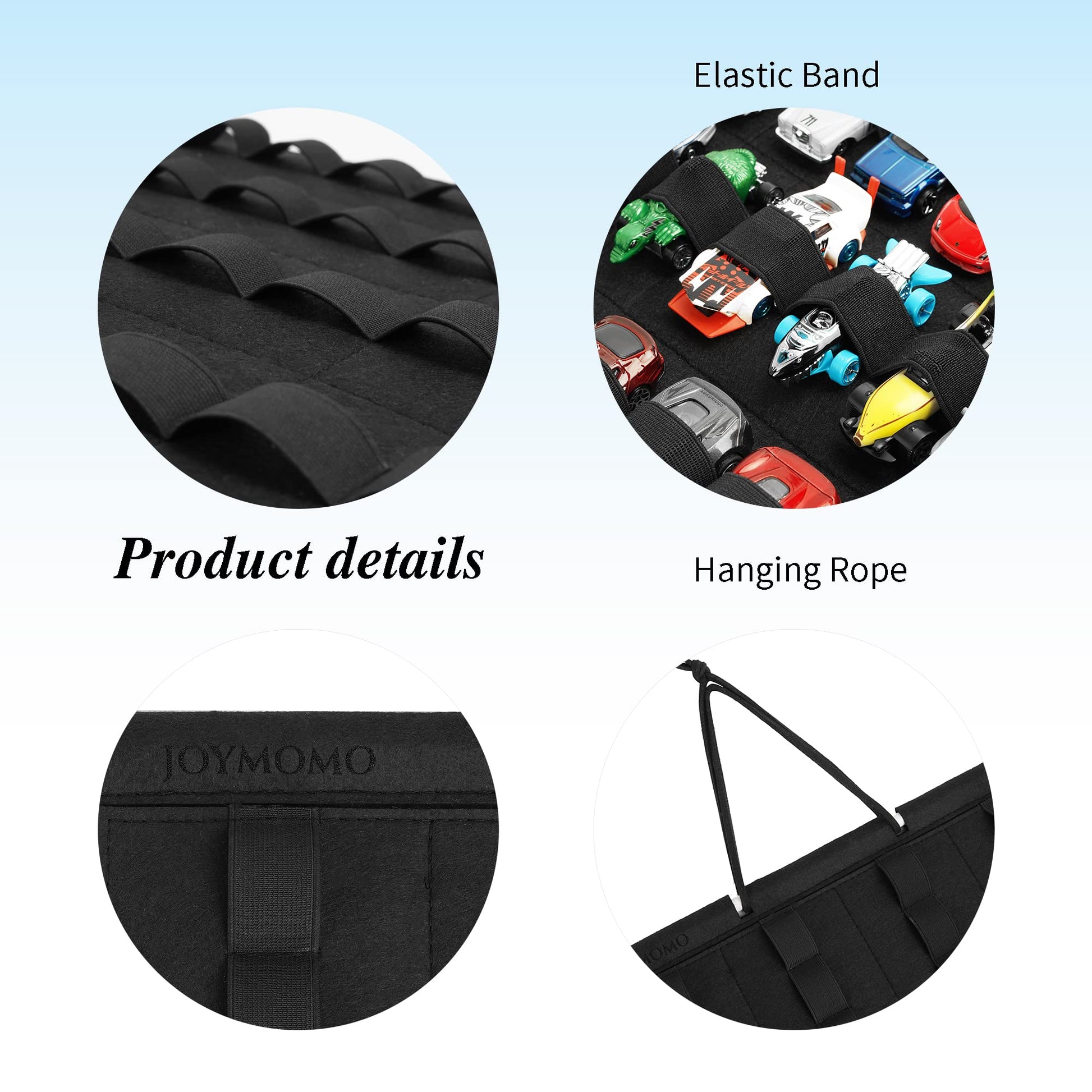 The toy cars display holder comes with large capacity design,each row has 15 elastic bands, there are 4 rows in total, which can hold up to 60 toy cars,the elastic straps protect toy cars from scratching each other.