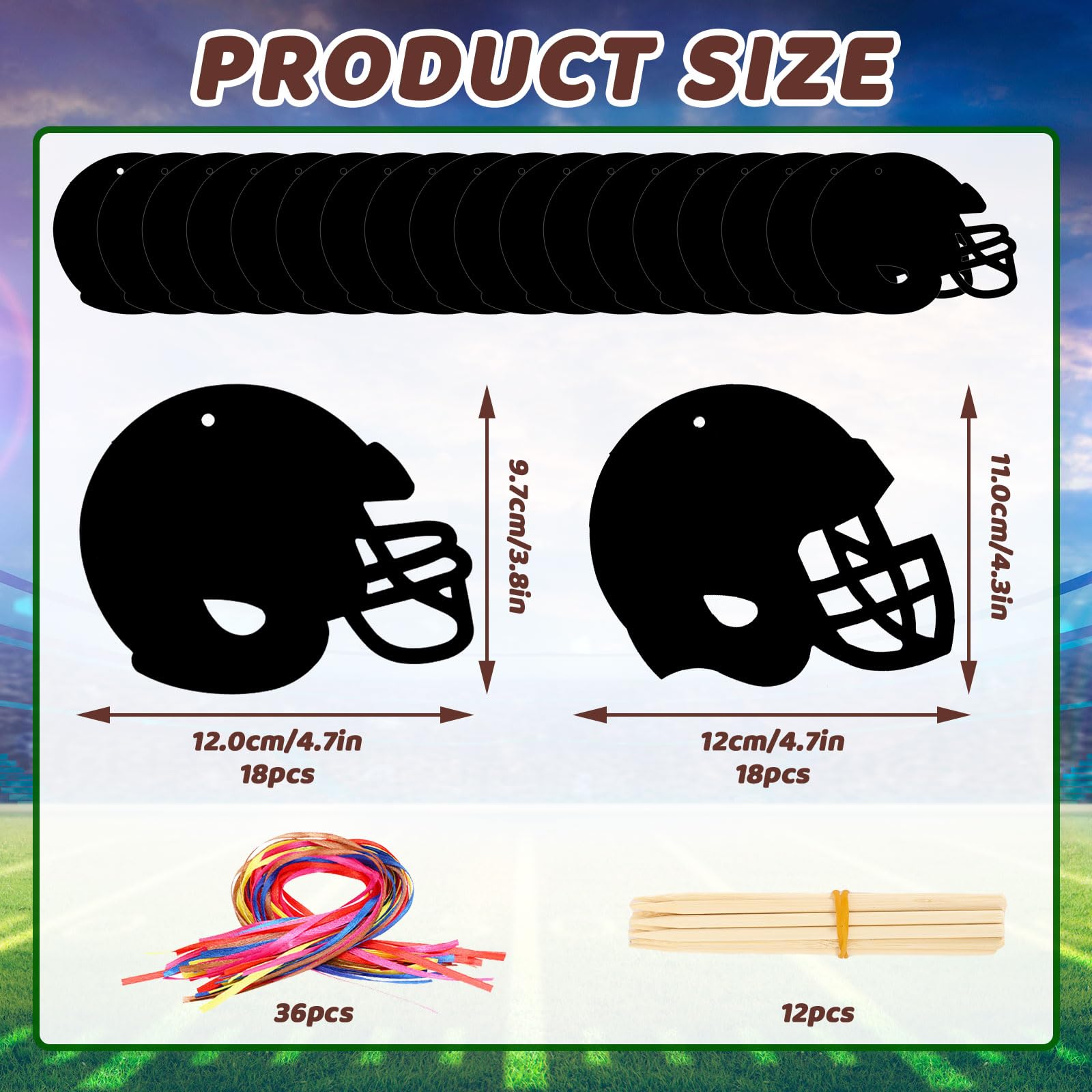 In this challenging and growing learning journey, let our football crafts for kids become your indispensable partner. The well-designed football party favors are not only a practical stationery, but also a work of art that inspires inspiration and motivation. Football rainbow scratch paper is made of reliable thick cardboard, which ensures the stability and durability of the structure and is not easy to be deformed or damaged even if used frequently. The stick made of natural wood feels warm, smooth and comfortable. The suspender is made of fine satin material, which is not only beautiful and elegant, but also easy to carry, recording your learning moments anytime and anywhere. Innovative scratch design makes the use of football birthday party favors simple and fun. Just pick up the attached wooden stylus and gently scrape the black coating on the surface to gradually expose the hidden rainbow primer, making scratch art for kids easy for you to mark books or documents. The football crafts are not only very interesting, but also a wonderful choice for school activities, classroom rewards, birthday parties, back-to-school surprises, football matches, sports and other occasions. Football crafts can also be hung on backpacks, windows, walls and other places, adding more creativity and fun to study and life, making rainbow scratch paper an ideal choice for parents and teachers. Whether celebrating victory, adding festival atmosphere or displaying individuality, the football theme scratch art for kids can add a unique style to your occasion. Specifications: Material: paper, wood Color: rainbow color Size: 4.7 x 3.8 inches /12 x 9.7 cm Package Includes: 36 football helmets scratch cards 12 scratch tools 36 ribbons