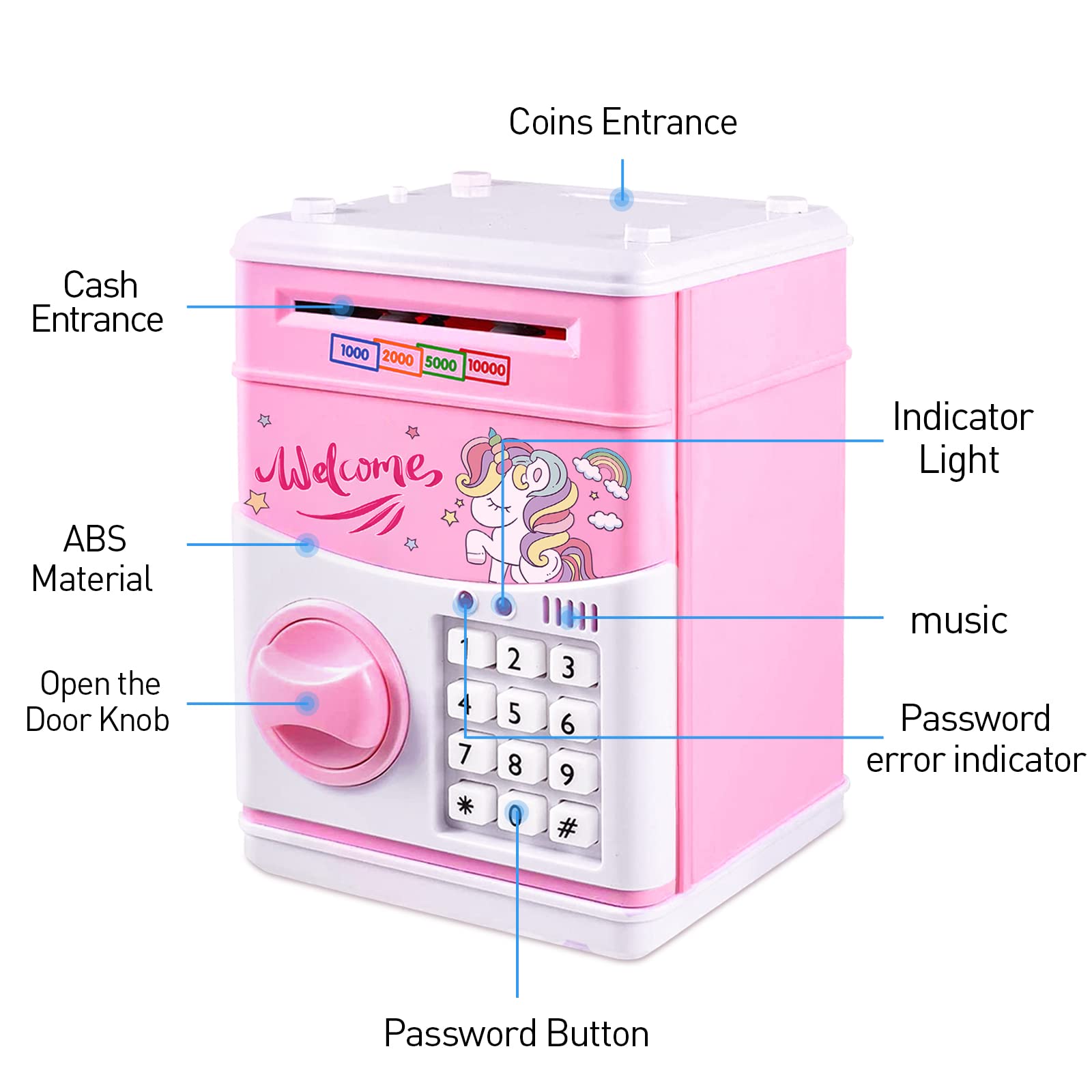 Best gift for Kids This cute cartoon piggy bank can suck the dollars in like an ATM machine and with song play function, encorage kids saving and learning how to save money. A great gift on Christmas, Xmas, Birthday, New Year, Thanksgiving Day, Children Day for kids, girls, boys. How to change password: 1.Enter the current password (the default password is 0000) to open the door. Long press ''*'' button, the green and red lights flashing. 2. While holding the ''*'' button, input 4 new passwords in 15 seconds, press the ''#'' button to confirm new password. Two lights stop flashing. Note: If the new password is not entered in 15 seconds, the program will stop and the program must be restarted. If you forget your password You can remove the battery, and re-install it after 5 minutes, the password will be restored to ''0000'', then you can reset your password again. Specifications: 1.Material: Environmental ABS plastic 2.Power Source: 3 AA Battery(Not included) 3.Product Size: 5.3 x 4.8 x 7.6 Inches Package includes: 1 x Electronic Piggy Bank 1 x English Use Manual