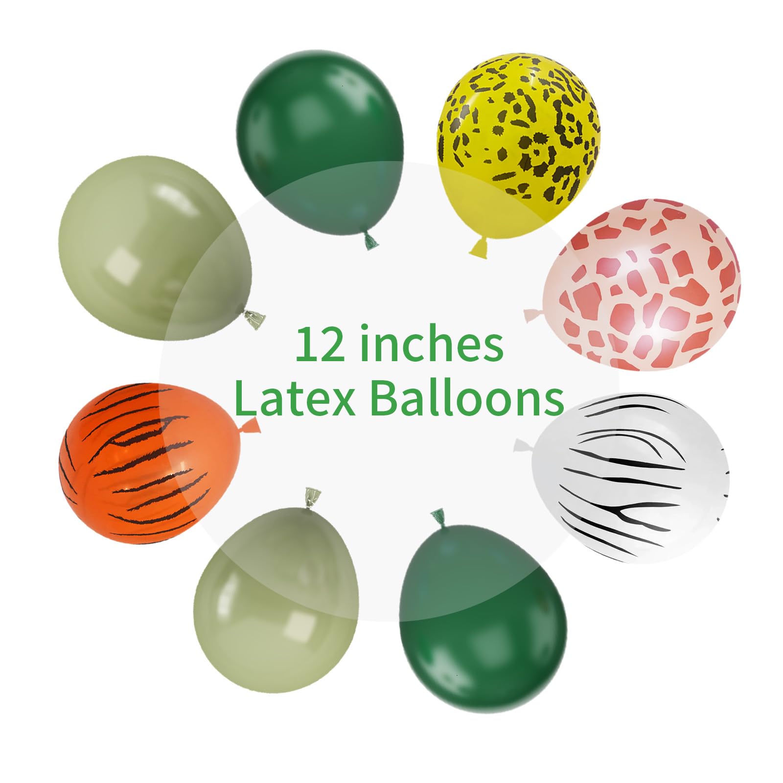 - Q: What types of animal print balloons are included in the Jungle Balloons pack? A: The Jungle Balloons pack includes a variety of animal print designs: 5 leopard print balloons, 5 zebra print balloons, 5 deer print balloons, and 5 tiger print balloons, along with 5 sage green and 5 retro green balloons.