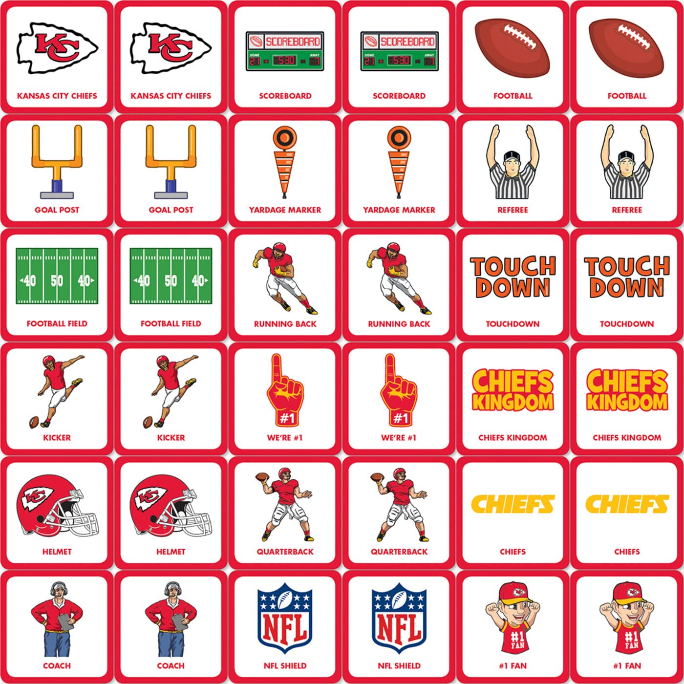Kansas City Chiefs NFL Matching Game. Officially Licensed NFL Product |Contains 18 matching pairs of unique symbols from the Kansas City Chiefs. Perfect for ages 3 and up. MasterPieces - An American Puzzle & Game Company. We stand behind our products and guarantee your satisfaction.