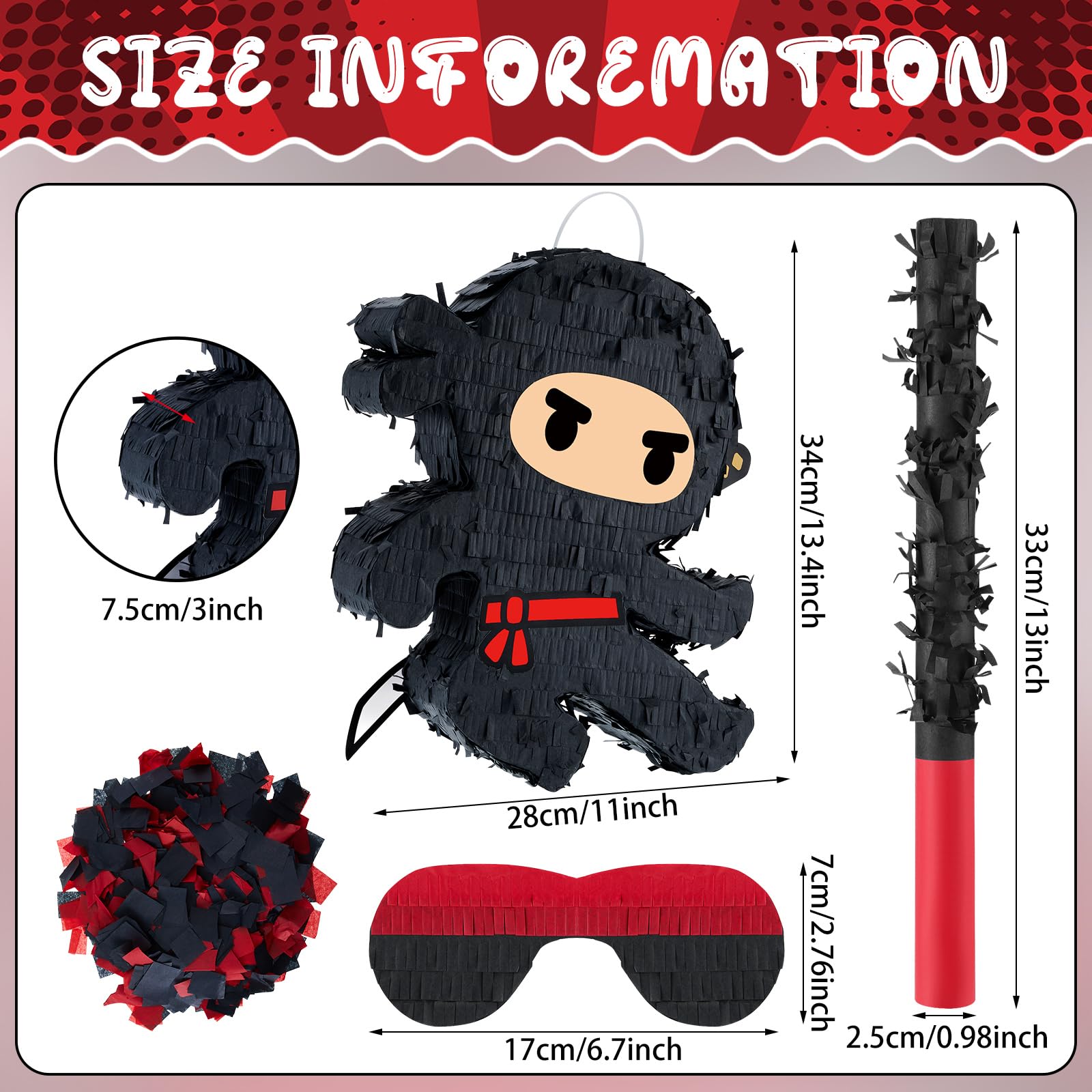Features: The ninja piata along with the additional tools can be applied as company party decorations, anime party decorations, karate birthday party supplies, ninja birthday decorations for boys and girls, etc. Gather the party guests together for some classic piata fun with these ninja themed party supplies. You can fill the piata with your favorite candy and a few little surprises. When its finally time to get together to celebrate a birthday or special occasion, a piata filled with delicious treats, surprises and toys will be a great surprise. Specifications: Material: Color: basically blackPiata size: about 13 x 13 x 3 inchesPackage includes: 1 x Black ninja Features: The ninja piata along with the additional tools can be applied as company party decorations, anime party decorations, karate birthday party supplies, ninja birthday decorations for boys and girls, etc. Gather the party guests together for some classic piata fun with these ninja themed party supplies. You can fill the piata with your favorite candy and a few little surprises. When its finally time to get together to celebrate a birthday or special occasion, a piata filled with delicious treats, surprises and toys will be a great surprise. Specifications: Material: Color: basically blackPiata size: about 13 x 13 x 3 inchesPackage includes: 1 x Black ninja piata1 x Blindfold1 x Piata Stick1 x Confetti packNotes: Manual measurement, please allow slight errors in size. The color may exist a slight difference due to different screen displays.1 x Blindfold1 x Piata Stick1 x Confetti packNotes: Manual measurement, please allow slight errors in size. The color may exist a slight difference due to different screen displays.