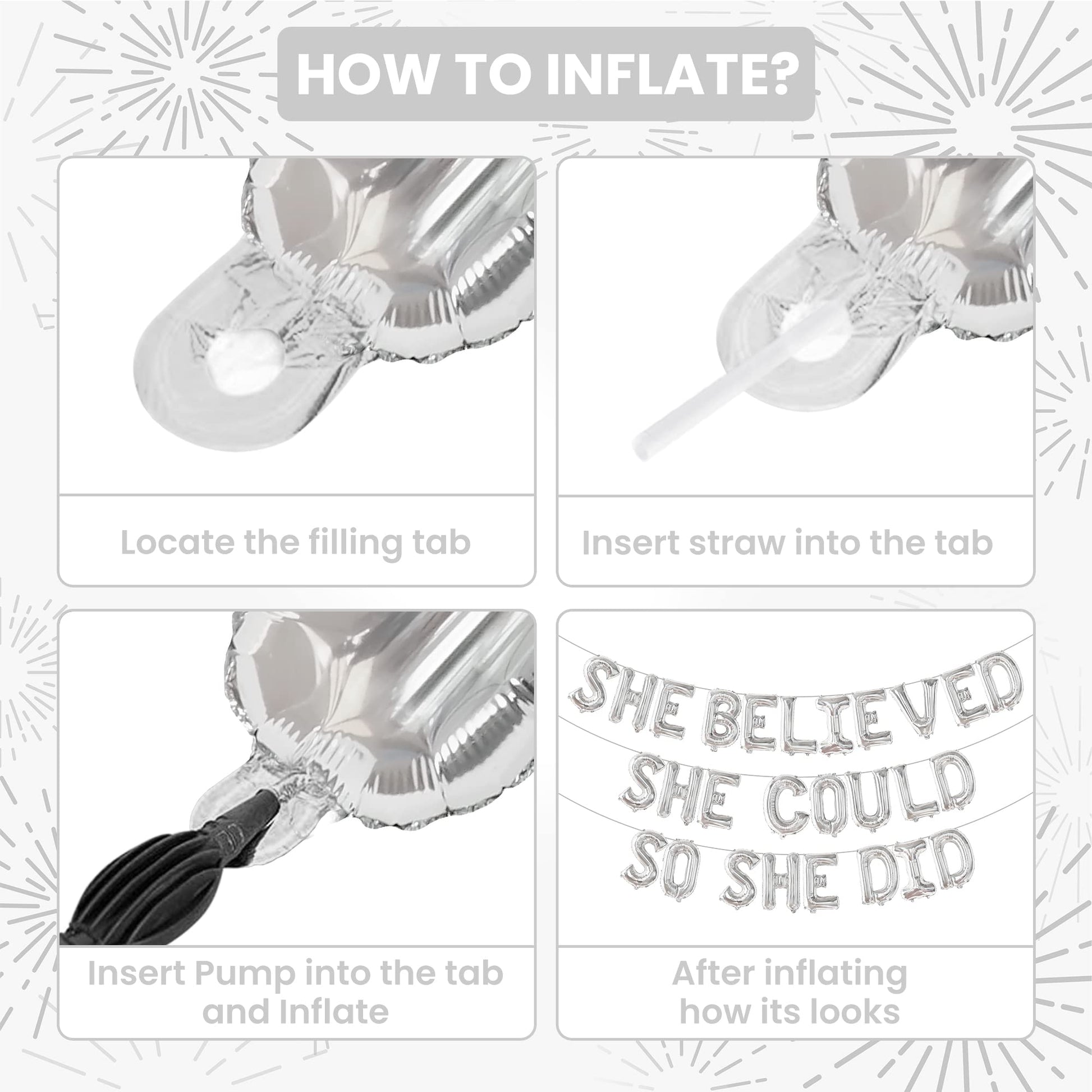 - Q: Can I fill these balloons with helium? A: No, the She Believed She Could So She Did balloons are not designed to be filled with helium. They come with a self-sealing valve for easy inflation using air.