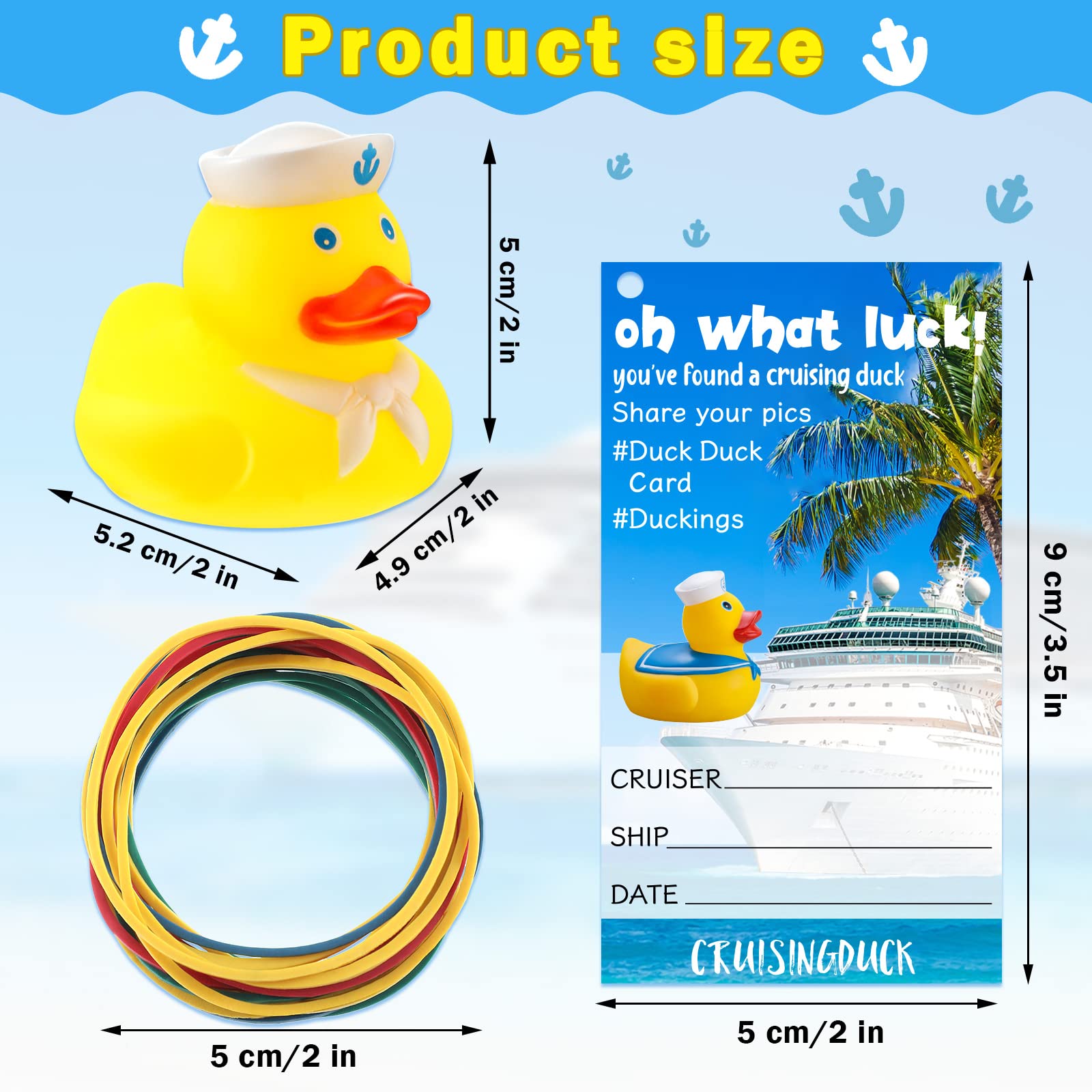 Features: With An Attractive And Delicate Design, The Cute Rubber Ducks Are Ideal Gifts Which You Can Send To Your Family On Some Important Occasions, Such As Birthday, Festival, Wedding, Anniversary, Halloween, Christmas, New Year And So On. They Will Be Happy And Surprised When They Receive These Funny Duck Toys. Our Sufficient Supply Of Carnival Cruise Kits Will Enable You To Invite Your Family To Participate In Your Diy Projects, Allowing You To Hone Your Manual Skills And Enjoy The Process. Specifications: Material: Sailing Ducks: Rubber Cruise Duck Tags: 250 G Coated Paper Rubber Band: Rubber Color: As Shown In The Pictures Size: Sailing Ducks: About 5.2 X 4.9 X 5/ 2.05 X 2 X 2 Inches Cruise Duck Tags: About 9 X 5 Cm/ 3.5 X 1.97 Inches Rubber Band: About 50 X 1.4 X 1.5 Mm/ 1.57 X 0.055 X 0.06 Inch Package Includes: 20 X Sailing Ducks 20 X Sailing Duck Tags 20 X Rubber Bands Notes: Manual Measurement, Please Allow Slight Errors On Size. The Color May Exist A Slight Difference Due To Different Screen Displays. Small Items Included, Adults' Supervision Is Needed When It Is Played By Your Little Ones.