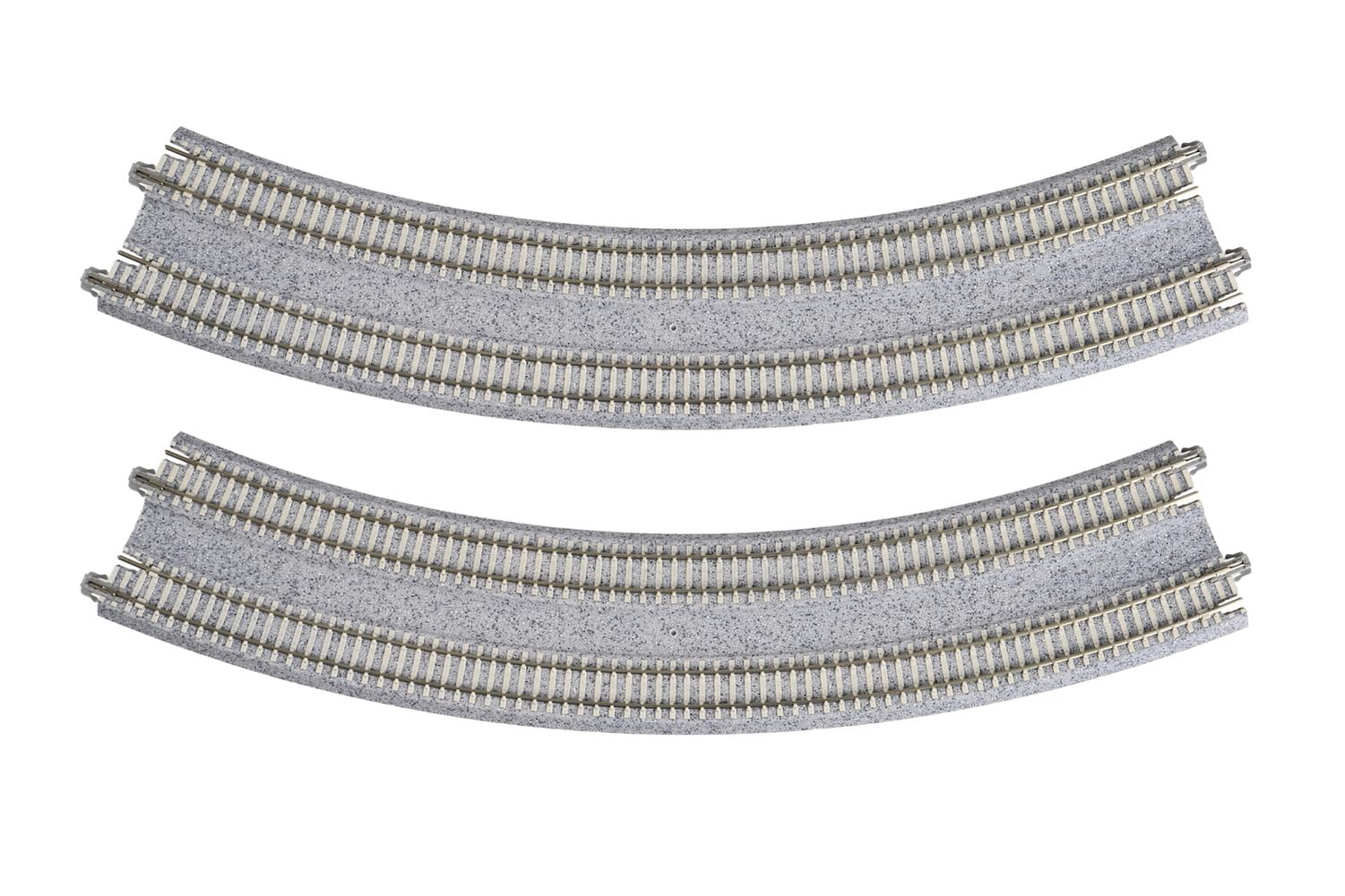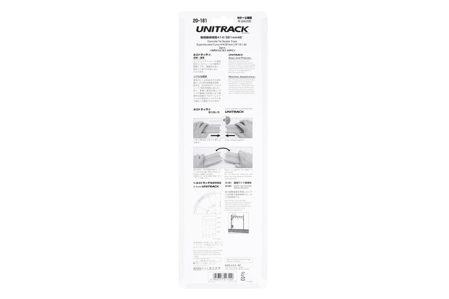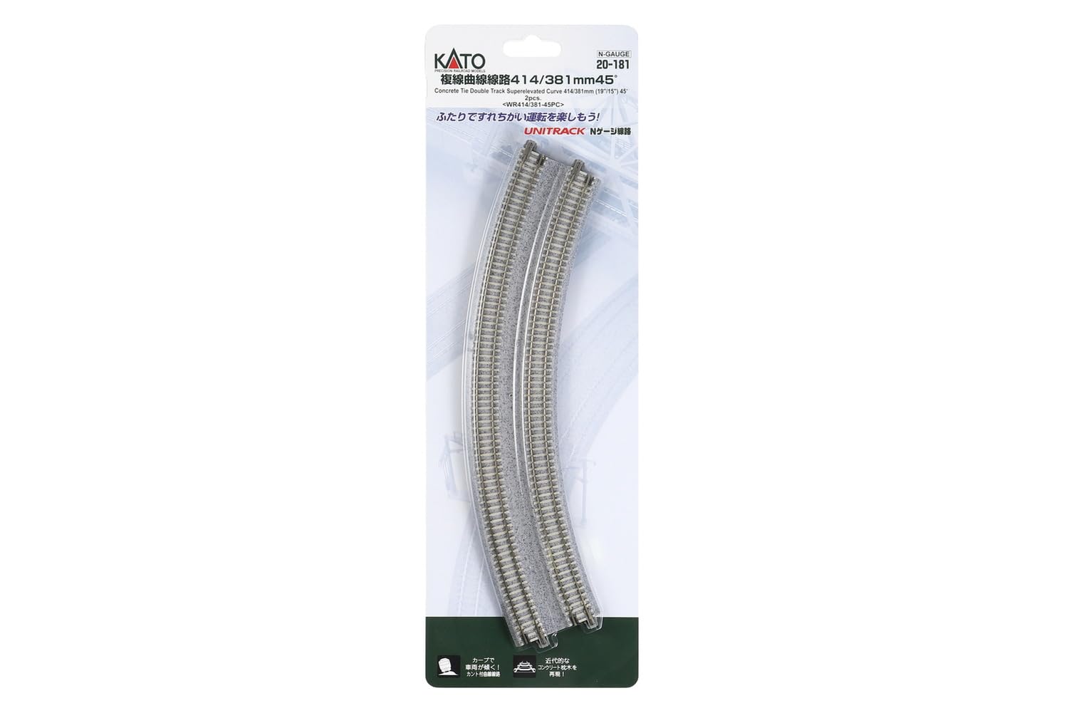 N Scale The next stage in realistic snap track - 'Superelevation' is the term used to describe track in which one rail is higher than the other, much like a banked curve on a freeway offramp or a high speed corner in NASCAR, these banked curves are specially designed to reduce wheel wear and increase both comfort and safety in all manner of trains, fast or slow, passenger and freight. These superelevated curves are a standard installation in modern railroads, and before now they were complicated and finicky to replicate at model railroad scale level, but no longer! Kato UNITRACK makes it simple with modular easement and superelevated curves, available with modern pre-cast concrete ties (which not only modernize the look of your rails, but help differentiate the pieces at a glance from non-banked track pieces). Please note that all of these Concrete Tie Double Track pieces are 100% compatible with our regular double and single track Unitrack pieces and bridges and can be added into your existing Unitrack layouts!