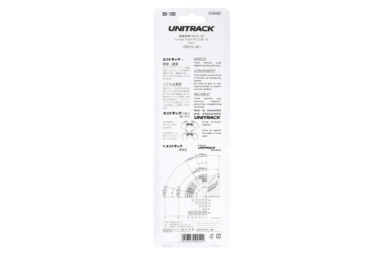 From the ManufacturerThis is a four pack of blister carded curve track pieces for use with the UNITRACK N gauge track system? The Curve radius and degree descriptions describe what portion of a complete circle (360) is made from each section and how big that circle will be (in this case approximately 25'', or double the radius? Radius measurements for curves such as these are measured from the center point of a circle to the center line of the track, making it easy to keep track of how large your layout will be when you're still in the planning stages!