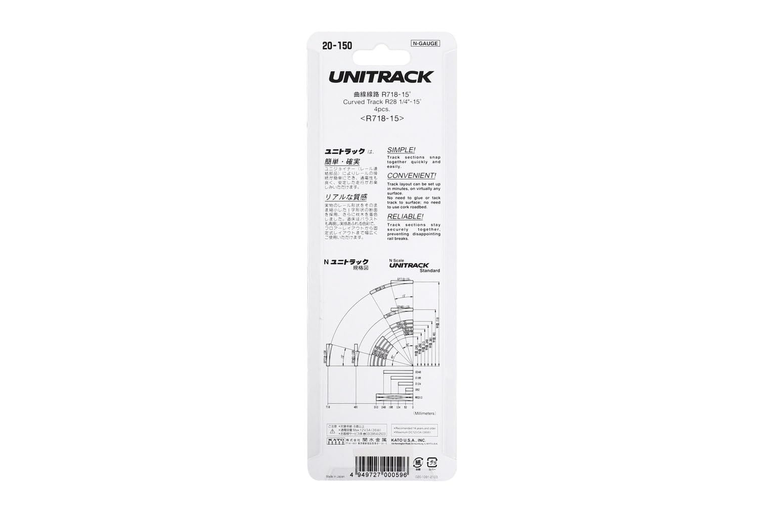 From the ManufacturerThis is a four pack of blister carded curve track pieces for use with the UNITRACK N gauge track system? The Curve radius and degree descriptions describe what portion of a complete circle (360) is made from each section and how big that circle will be (in this case approximately 57'', or double the radius? Radius measurements for curves such as these are measured from the center point of a circle to the center line of the track, making it easy to keep track of how large your layout will be when you're still in the planning stages!